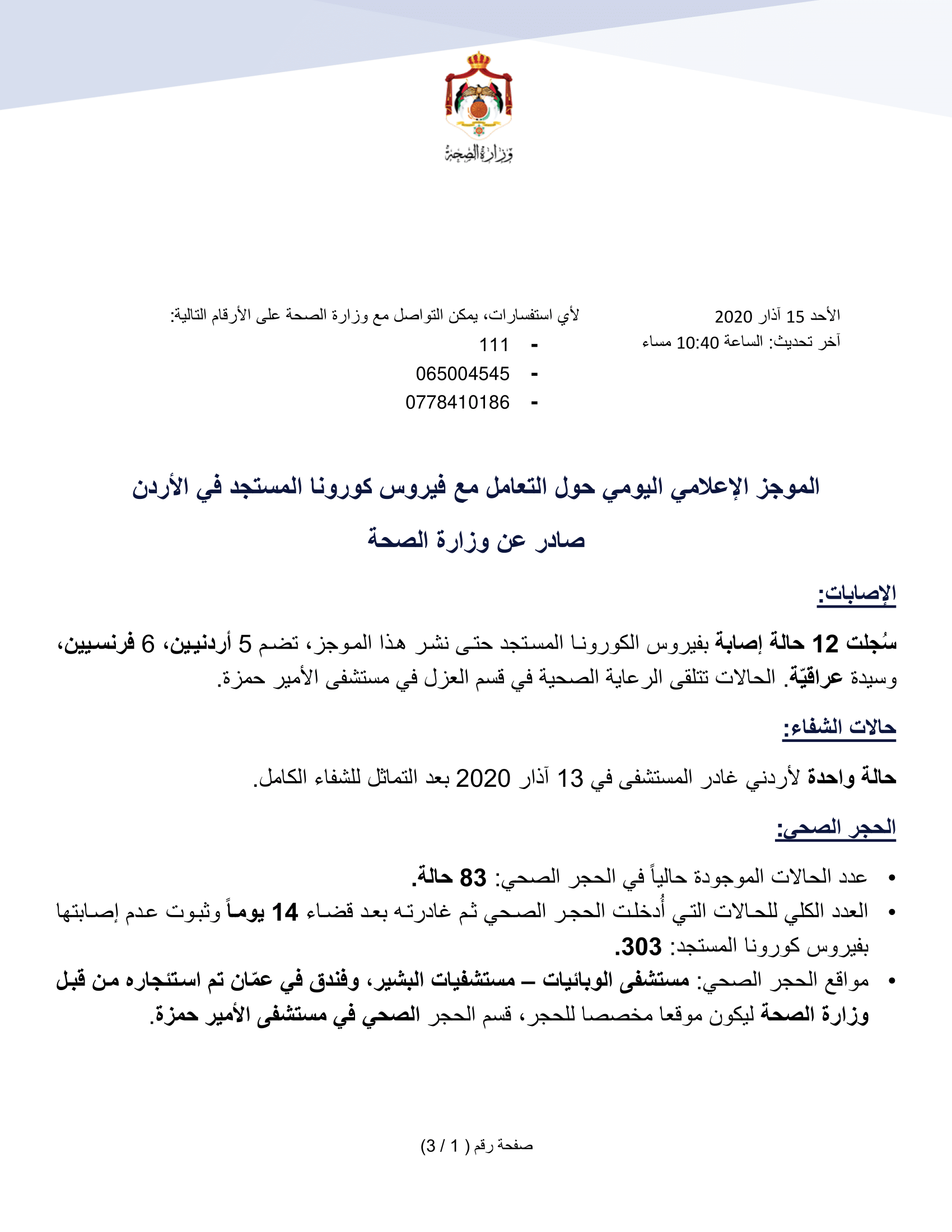 الناطق باسم اللجنة الوطنية للأوبئة نذير عبيدات، كان قد أعلن الأحد، أن عدد الحالات المصابة حاليا بفيروس كورونا المستجد في الأردن وصل إلى 12 حالة.