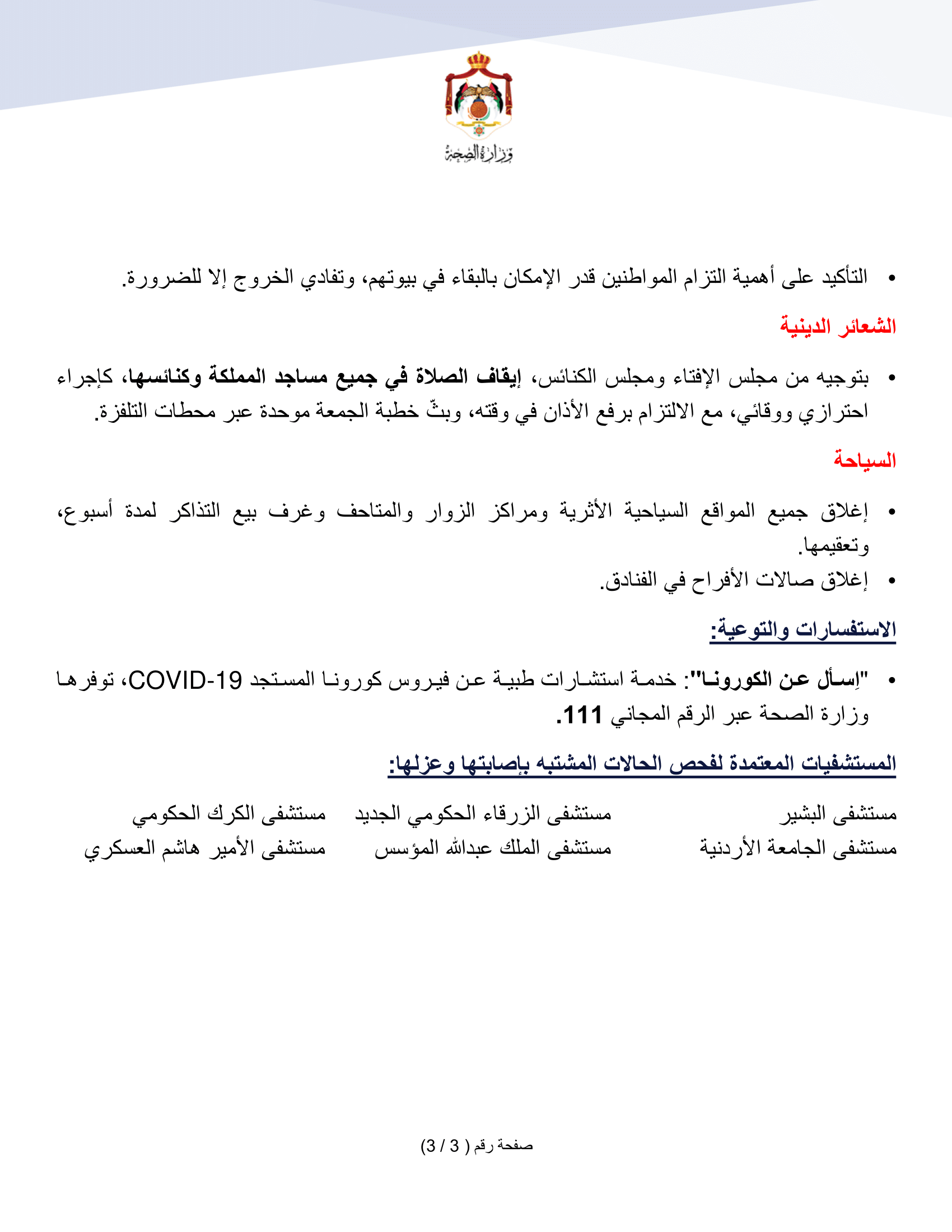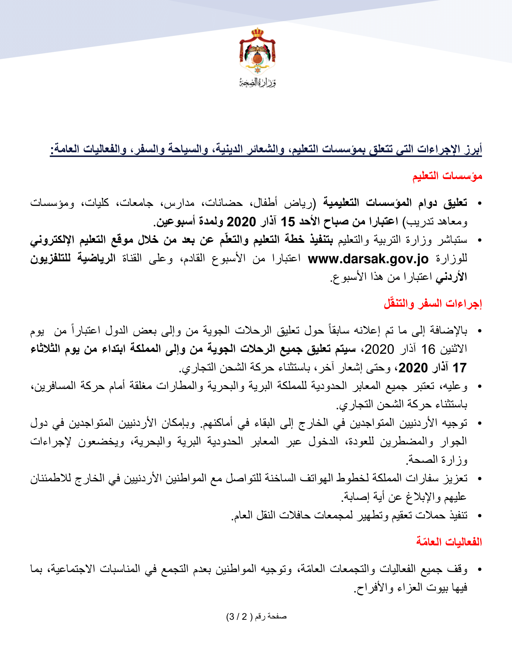 وكان وزير الصحة الدكتور سعد جابر، أعلن في وقت سابق الأحد، إصابة أردنيين اثنين، و4 سياح فرنسيين بالفيروس في الأردن، الذي دخل مرحلة احتواء الفيروس. وأضاف أن أحد المصابين الأردنيين جاء من بريطانيا، فيما خالط المصاب الثاني سائحة أميركية غادرت الأردن. "الحكومة أجرت فحوصا لـ 250 شخصا معظمهم عرب، والنتائج كانت سلبية،" بحسب جابر. "فرق التتبّع في وزارة الصحّة تتعقّب جميع المخالطين للمصابين، وتجري الفحوصات اللازمة للكشف عن حالاتهم"، بحسب جابر. وأضاف جابر لـ "المملكة" أن جميع المخالطين للسائحة الأميركية تم تتبعهم، وعددهم 28، أعداد المخالطين للمصاب الأردني القادم من بريطانيا 9 أشخاص. وأوضح جابر أن مواطنا أردنيا قدم من بريطانيا بتاريخ 8 آذار/ مارس، شعر بأعراض المرض عند الساعة الثانية عشرة منتصف الليل، حيث تم أخذ عينات وكانت النتيجة إيجابية، وتم وضعه في قسم العزل. وأشار إلى أنه وعند الساعة 3 فجرا، اشتكى سائح من الجنسية الفرنسية في أحد فنادق عمّان من ضيق في الصدر، وتم إرسال فريق للتأكد من وضعه وبرفقته 3 فرنسيين آخرين، حيث تم أخذ عينات من السياح الأربعة، وظهرت النتائج إيجابية الساعة 4 صباحا بمعنى أنهم يحملون الفيروس، وتم إدخالهم عند الساعة 5 صباحا إلى قسم العزل. وبالنسبة للحالة 6، قال جابر، إنها "لأردني خالط سائحة أميركية كانت قادمة من مصر، ومكثت في الأردن يومين، وغادرت بعدها"، لافتا إلى أنه "وبعد تلقي رسالة تفيد بإصابتها بالفيروس تم أخذ عينات من المخالطين لها في الفندق، وكانت نتيجة هذا المواطن ايجابية؛ والآن يعاد الفحص للتأكد وعلى الأغلب أنه مصاب بالفيروس". وأكد أن جميع الحالات المصابة أو التي نقلت المرض قادمة من الخارج، ونتوقع خلال اليومين المقبلين دخول آلاف المسافرين من الأردنيين القادمين من الخارج من مناطق موبوءة بالمرض، لافتا النظر إلى أنه سيتم إعطاء كل واحد منهم تعليمات الحجر المنزلي، وتعهد بالبقاء في المنزل، وفي حال ظهور أي أعراض، سيقوم فريق الرصد الوبائي باتخاذ الإجراءات اللازمة من ناحية تطهير المكان، وأخذ العينات منه ومن المخالطين. الحكومة أعلنت السبت مجموعة إجراءات وقرارات جديدة اتخذتها الحكومة للتعامل مع فيروس كورونا المستجد، تتضمن تعليق دوام المؤسسات التعليمية لمدة أسبوعين. 83 حالة في الحجر الصحي وذكر البيان أن عدد الحالات الموجودة حالياً في الحجر الصحي 83 حالة، فيما وصل العدد الكلي للحالات التي أُدخلت الحجر الصحي ثم غادرته بعد قضاء 14 يوماً وثبوت عدم إصابتها بالفيروس 303 حالات. الوزير جابر، قال عبر برنامج "صوت المملكة" الأحد، إنه يتم البحث حالياً عن فندق آخر للحجر الصحي، ليستضيف الأردنيين القادمين من بريطانيا، مضيفاً أن قدرة الأردن على الحجر تتراوح بين 250 إلى 350 حالة. وذكر: "وجدنا أن بريطانيا بؤرة مصدرة للفيروس "، مضيفاً أن 3 طائرات قادمة من بريطانيا ستصل الاثنين. وتوقع الوزير جابر وصول آلاف الأردنيين قبل تعليق الرحلات الجوية يوم الثلاثاء، دون أن يحدد العدد المتوقع. وقال الوزير جابر "نعتقد أن القادمين من بريطانيا سيتم الحجر عليهم صحيا". المملكة قد يعجبك أيضاًتوصيات وداعا للعمليات الجراحية المتعبة! الحل النهائى لبشرة نضرة من غير تجاعيد!! Goji Beauty كيف تبدين10 سنوات أصغر من قبل؟ كريم غوجي هل أنفقتِ 500 دينار لتبدين أصغر 15 عامًا؟ هذا الكريم المذهل يقوم بهذه الوظيفة وبسعر أقل Goji Cream تمتعي بإطلالة شبابية في أي سـن !! Goji Cream وداعا للعمليات الجراحية المتعبة! الحل النهائى لبشره نضره من غير تجاعيد!! كريم غوجي استمتعي ببشرة مثل بشرتي: جميلة وناعمة وصحية من جديد! مجرب وفعال هـل تنفقين مئات الدنانير لتبدين أصغر بخمسة عشرعامًا ؟ إليك الحل الأمثل و الأوفر Goji cream التعليقات الاسم : * التعليق : سيتم عرض التعليقات بعد مراجعتها من قبل الإدارة آخر الأخبار لجنة الأوبئة: قد يكون هناك حالات جديدة بكورونا في الأردن لا نعلم عنها بعد لجنة الأوبئة: قد يكون هناك حالات جديدة بكورونا في الأردن لا نعل