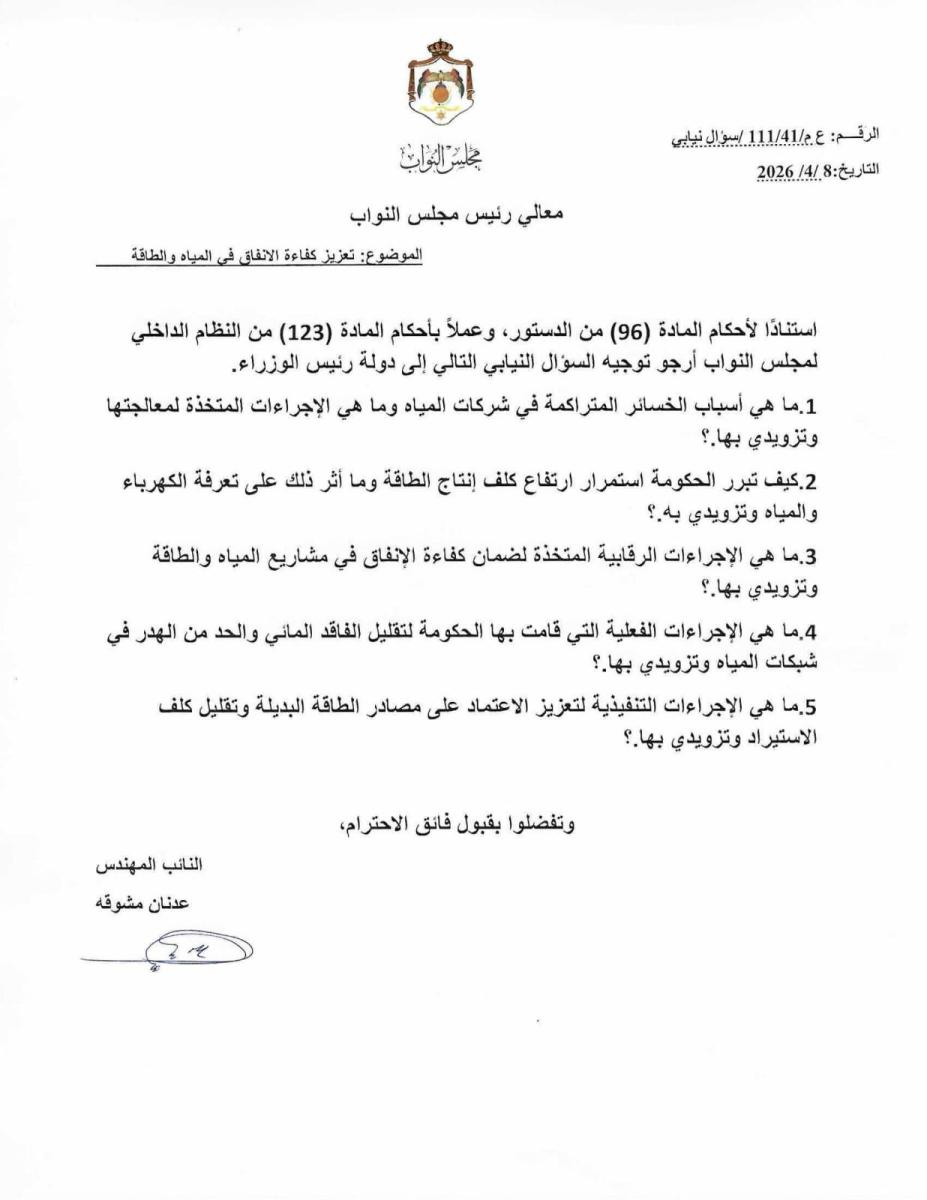 وجه النائب المهندس عدنان مشوقة سؤالاً نيابياً إلى رئيس الوزراء، استناداً لأحكام المادة (96) من الدستور والمادة (123) من النظام الداخلي لمجلس النواب، يطالب فيه ببيان الأسباب الكامنة وراء الخسائر المتراكمة في شركات المياه، والإجراءات التي اتخذتها الحكومة لمعالجة هذه الخسائر.
