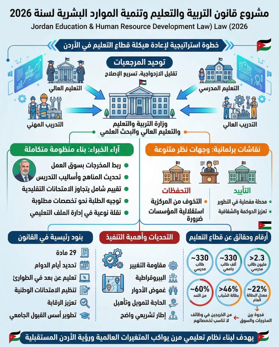 بعد نقاشات استمرت لأيام تحت قبة البرلمان، أقر مجلس النواب مؤخرا مشروع قانون التربية والتعليم وتنمية الموارد البشرية لسنة 2026، في خطوة تعد من أبرز محاولات إعادة هيكلة قطاع التعليم في الأردن، عبر توحيد المرجعيات التعليمية تحت مظلة وزارة واحدة، تمتد صلاحياتها من التعليم المدرسي وصولا إلى التعليم العالي والتدريب المهني.