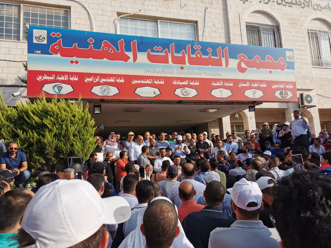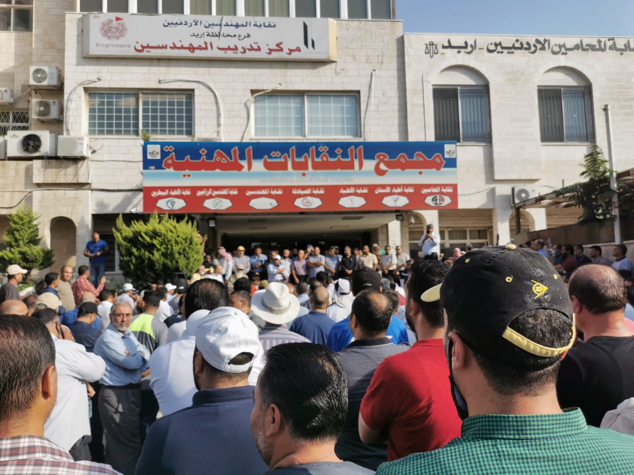اعتصم معلمون في محافظة اربد أمام مبنى مجمع النقابات المهنية، الأحد، للمطالبة باعادة فتح فروع نقابة المعلمين ومقرّ النقابة الرئيس والافراج عن المعلمين المعتقلين.