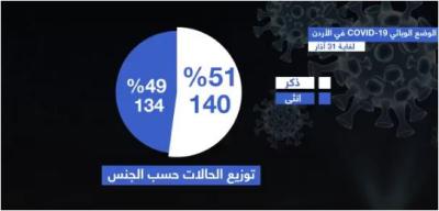 وقالت الوزارة، عبر فيديو "أنفوغرافيك" الخميس، إنّ العدد التراكمي حتى تاريخ 31 أذار بلغ 274 حالة، مشيرة إلى أنّ المنحنى الوبائي الأسبوعي أظهر تسجيل 151 حالة بالأردن خلال الأسبوع الـ 12، منذ ظهور الوباء.