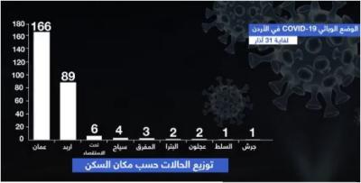 وحلّت عمّان في المرتبة الأولى من حيث عدد الإصابات بعدد 166 وتلتها إربد بـ 89 حالة، ثم المفرق 3 حالات، فالبترا حالتان، وعجلون حالتان، والسلط وجرش حالة واحدة لكل منهما.إضافة، إلى وجود 6 حالات تحت الاستقصاء.