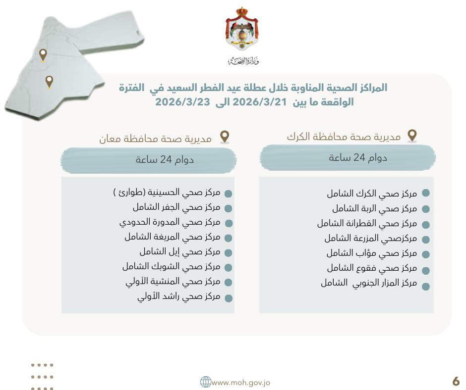 أعلنت وزارة الصحة أسماء المراكز الصحية المناوبة خلال عطلة عيد الفطر السعيد للفترة من 21 إلى 23 آذار 2026، في جميع محافظات المملكة، وعددها 106 مراكز صحية.