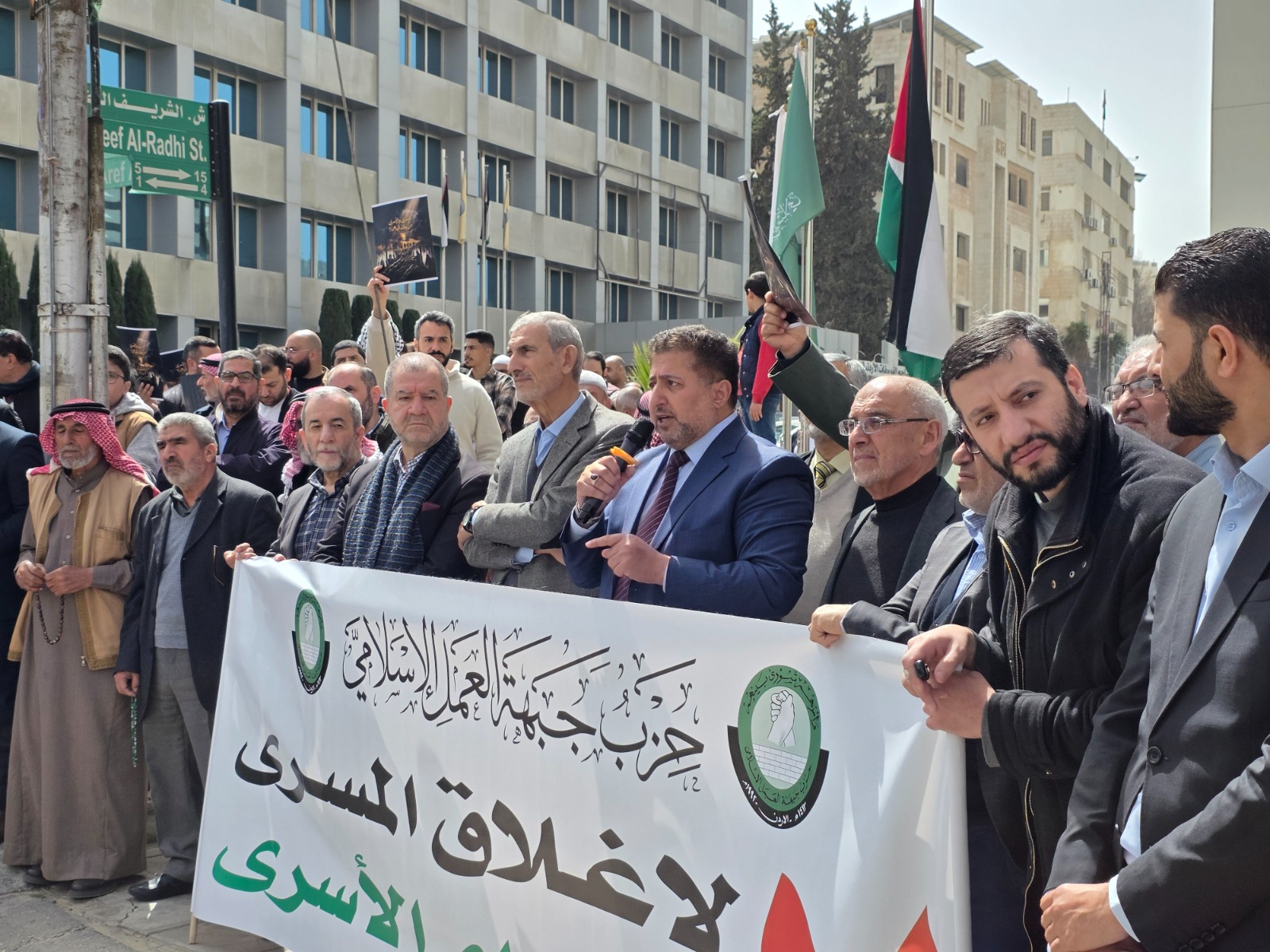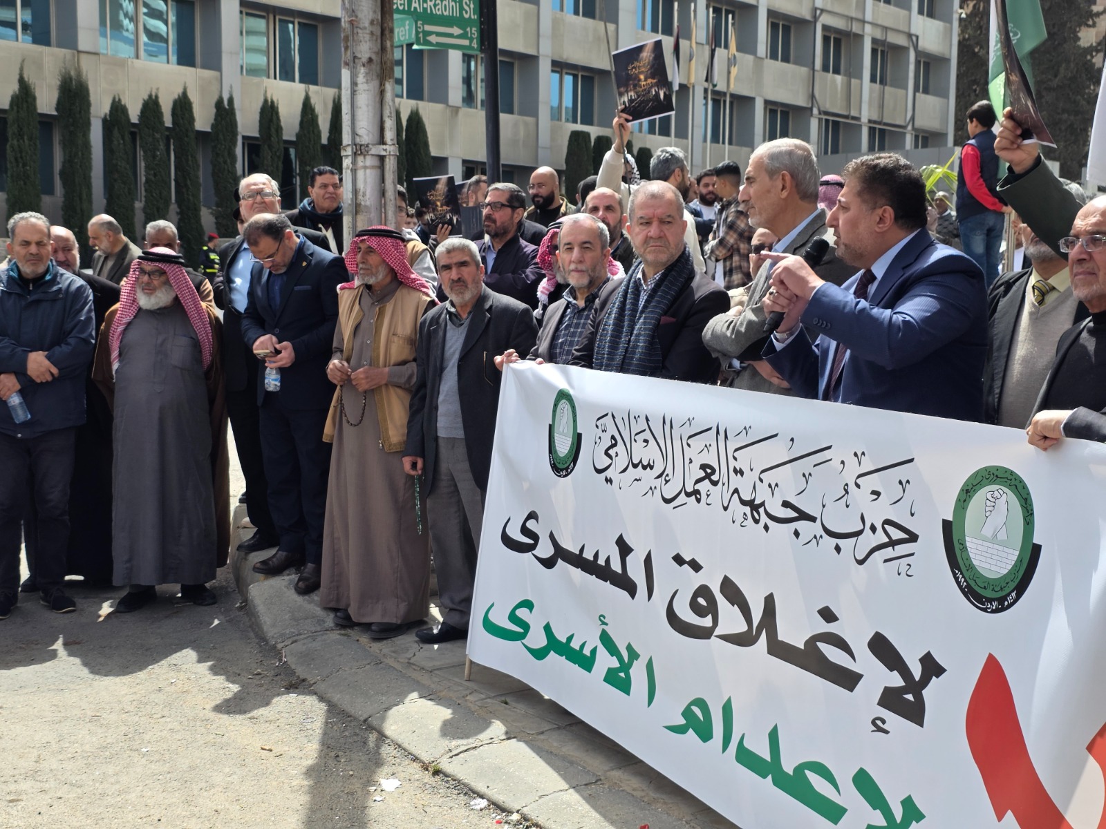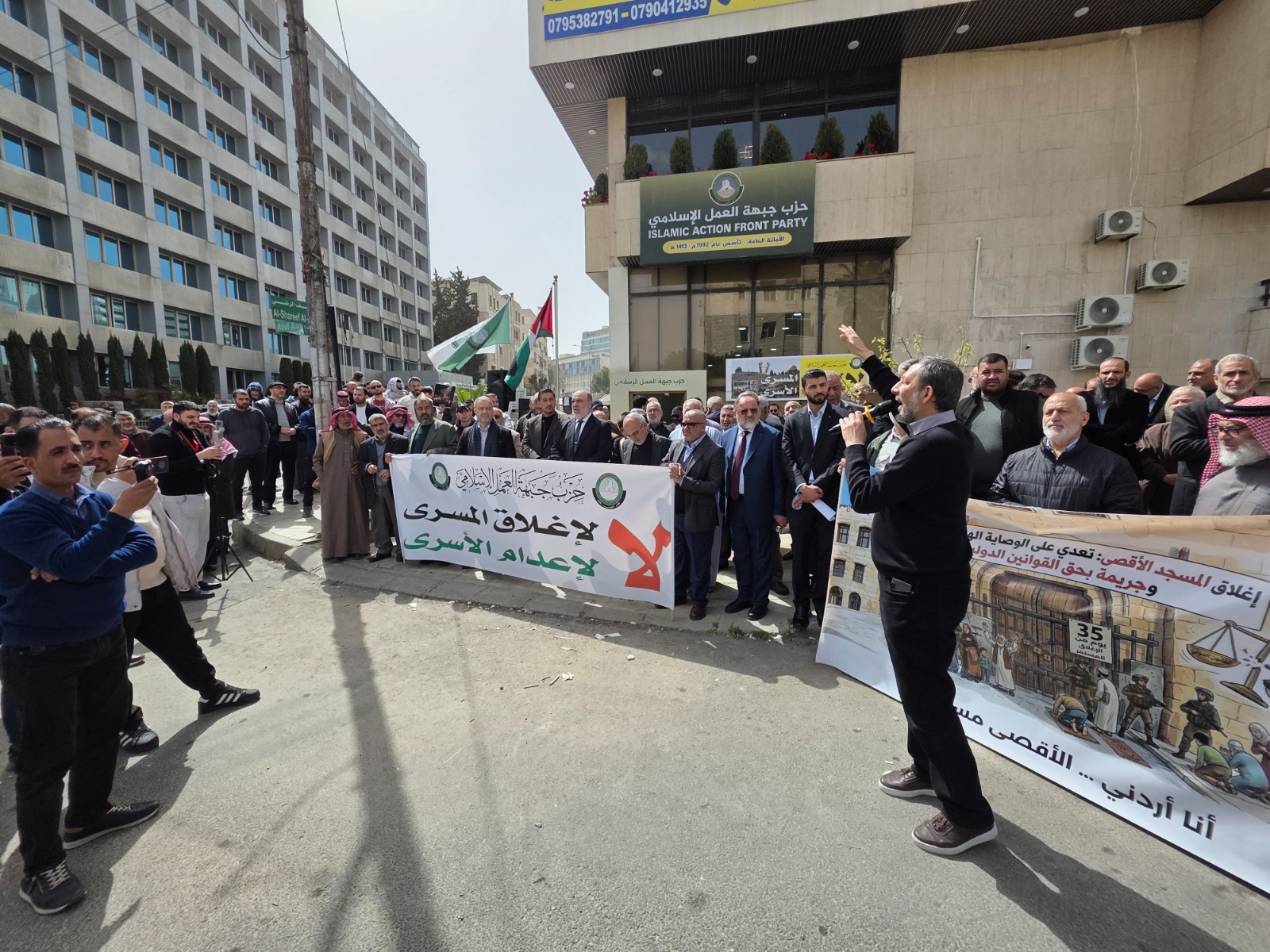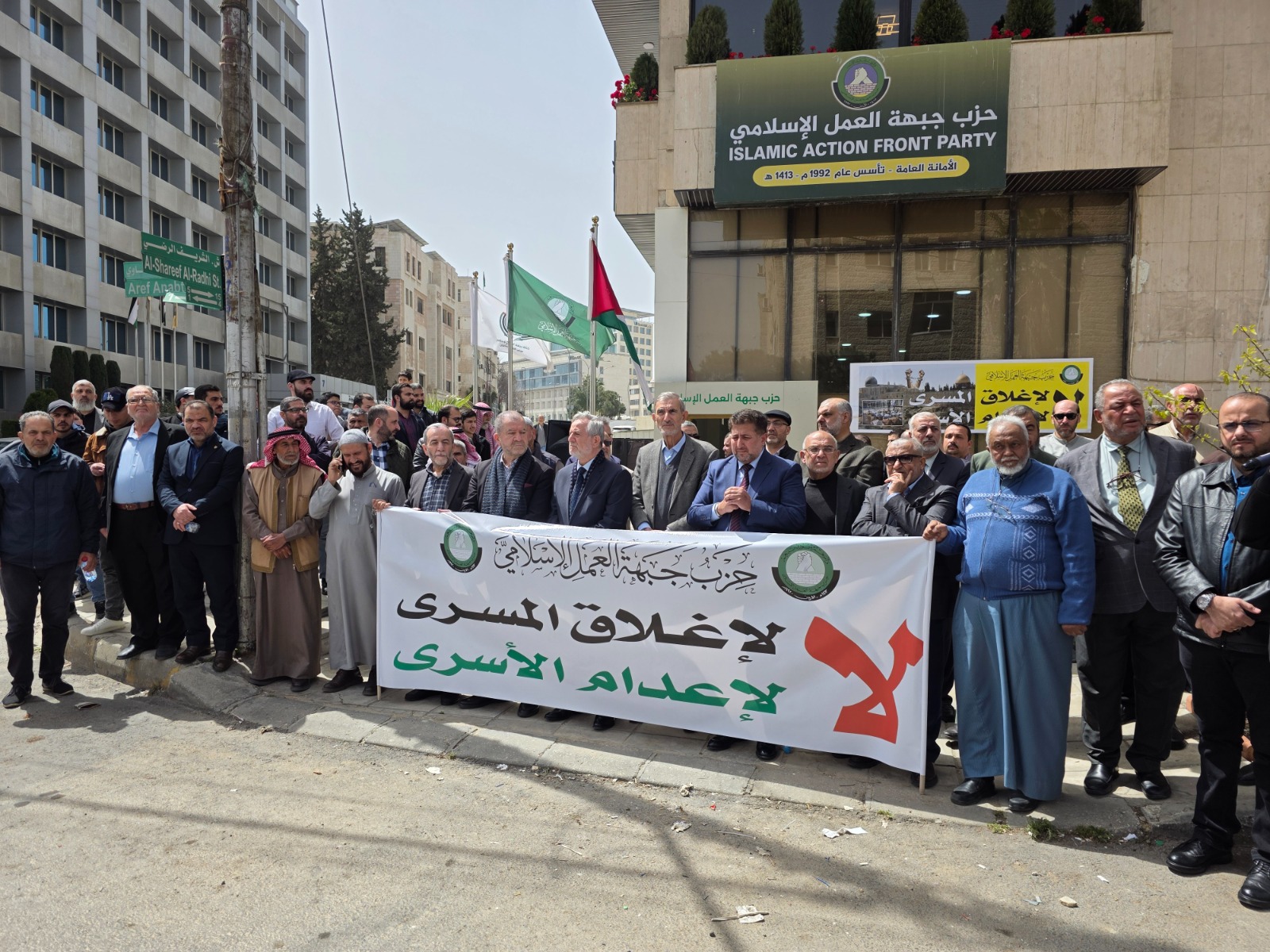 The Islamic Action Front Party held a central protest stand outside its headquarters in the Abdali district, in rejection of the closure of Al-Aqsa Mosque and in condemnation of the prisoner execution bill, demanding effective official Jordanian and Arab action against what it described as criminal Zionist practices.