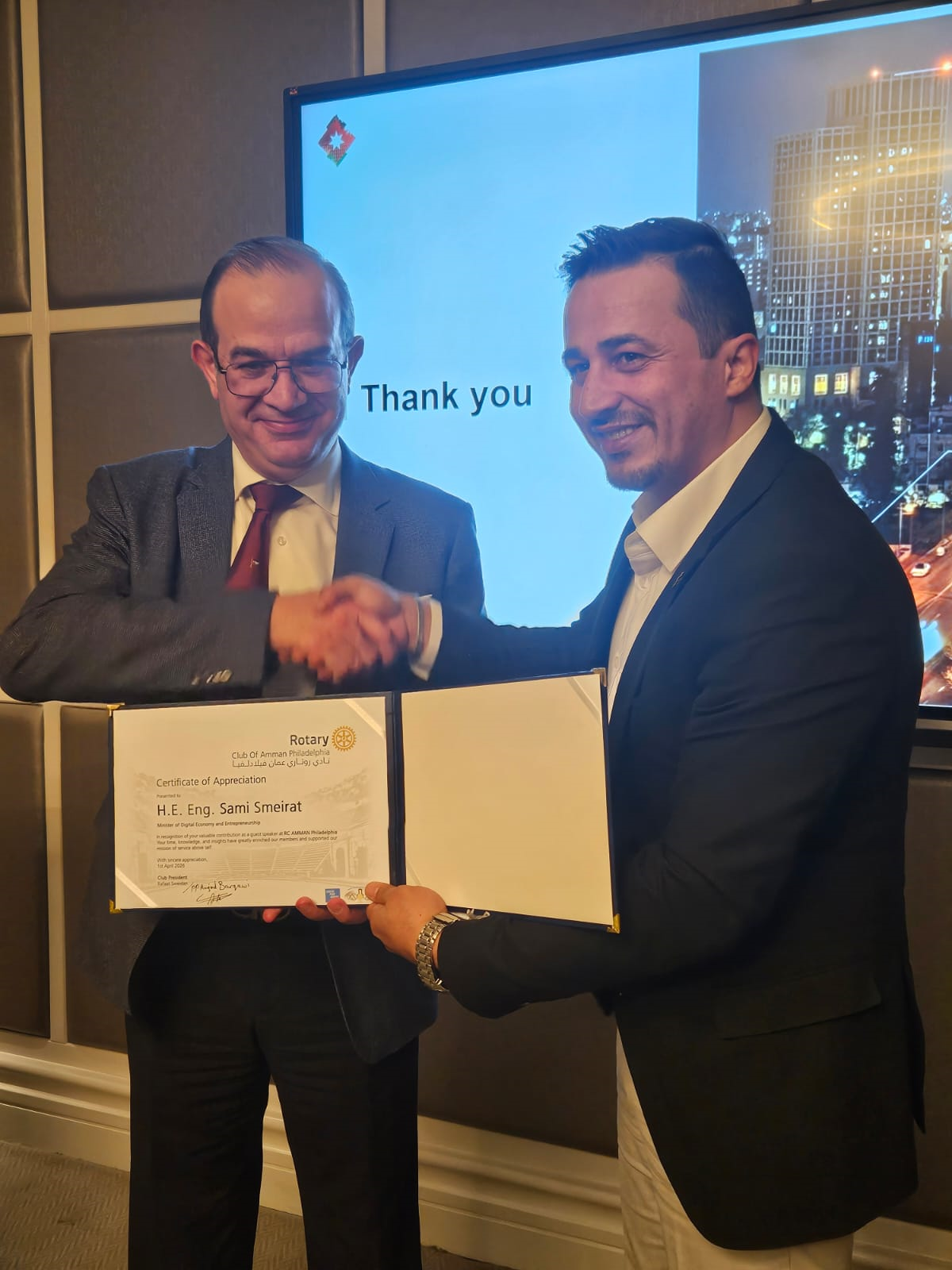 In a comprehensive meeting organized by the Rotary Club of Amman Cosmpolitant at the Four Seasons Hotel, Minister of Digital Economy and Entrepreneurship Sami Smeirat presented an overview of the implementation of the digital phase of Jordan's National Modernization Plan. He emphasized that the government is working in harmony with the public and private sectors, under the supervision of the Royal Court, to implement an integrated program that combines economic modernization, public sector development, digital transformation, and social protection.