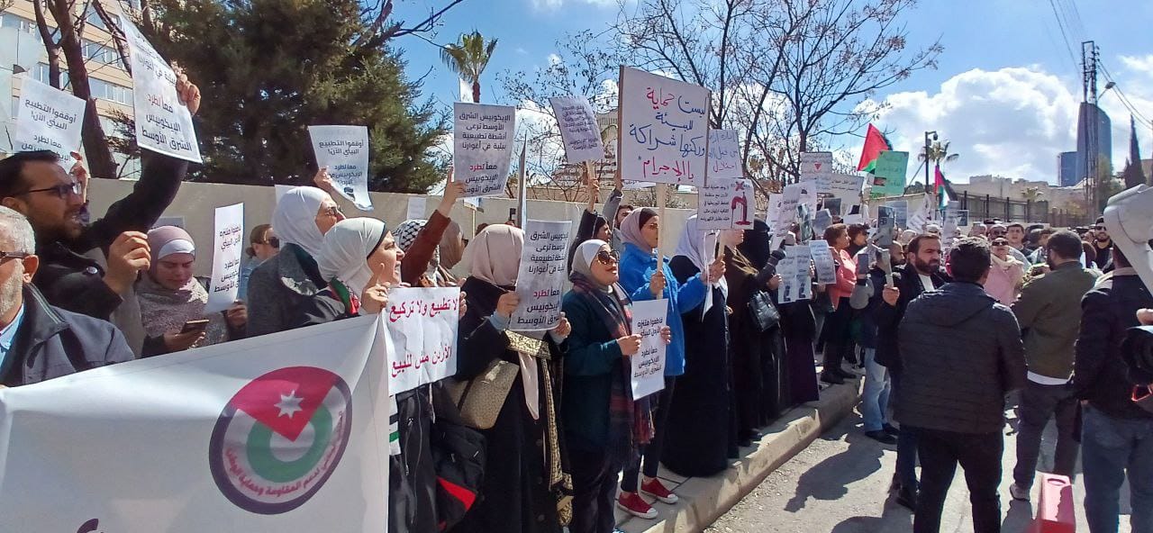 ورفع المشاركون في الاعتصام لافتات تطالب بوقف كافة أشكال التطبيع مع العدوّ الصهيوني، ووقف التعاقد مع هذه الشركة الصهيونية التي تهدد الأمن القومي الاردني في أهم شيء وهو الغذاء