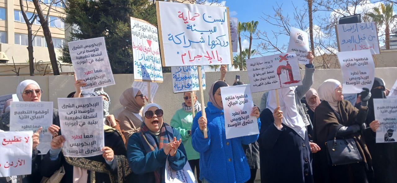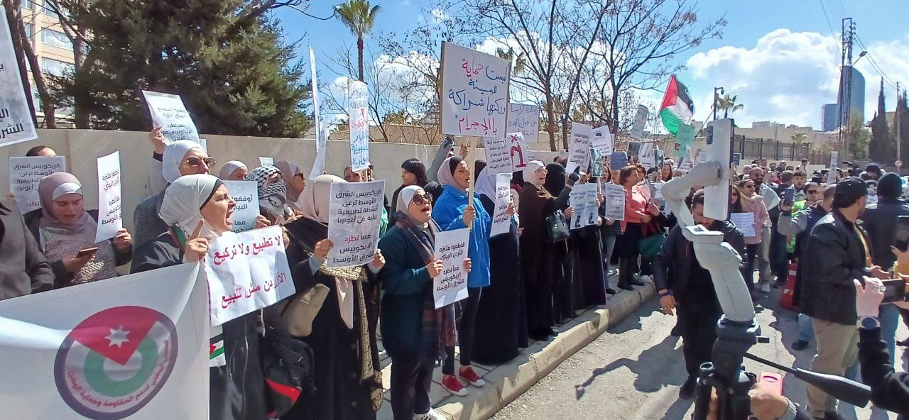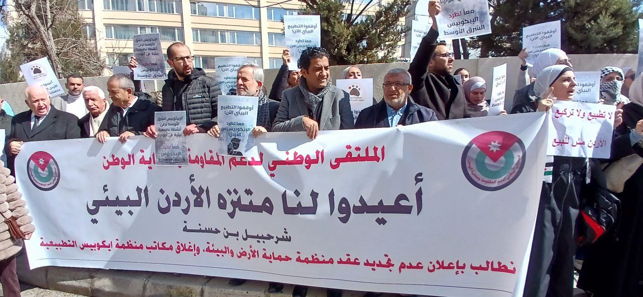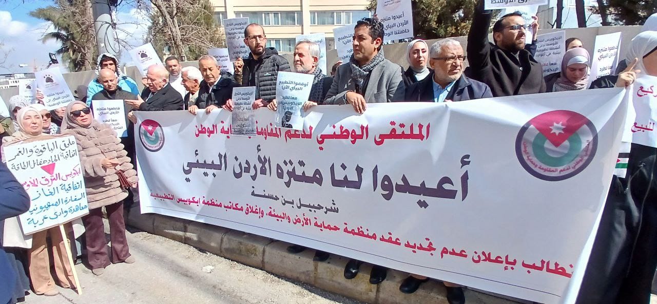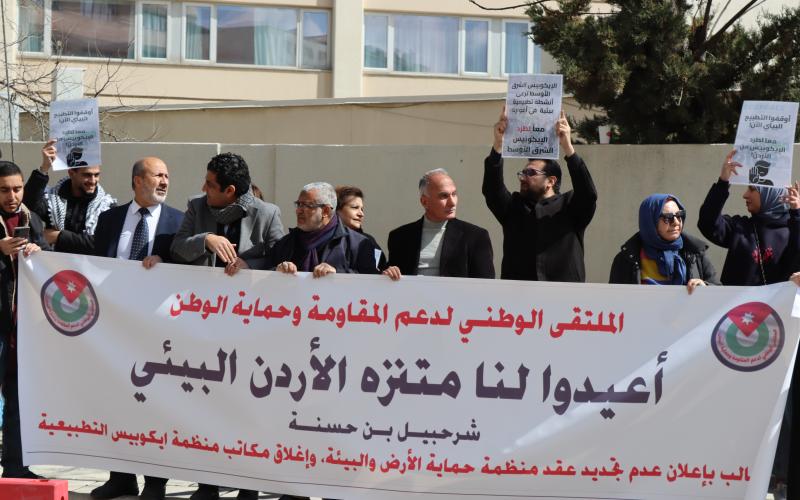 أقام الملتقى الوطني لدعم المقاومة وحماية الوطن ظهر اليوم الثلاثاء، اعتصامًا شعبيًا أمام سلطة وادي الأردن، وذلك للمطالبة بعدم تجديد العقد الذي يمنح منتزه الأردن البيئي في الأغوار الشمالية لمنظمة صهيونية، ولإنهاء نفوذ الفرع الأردني لمنظمة إيكوبيس الصهيونية في الأغوار باعتبارها سلة الغذاء الأردنية.