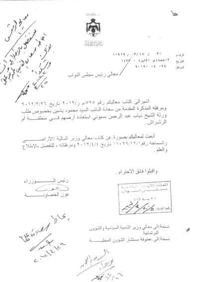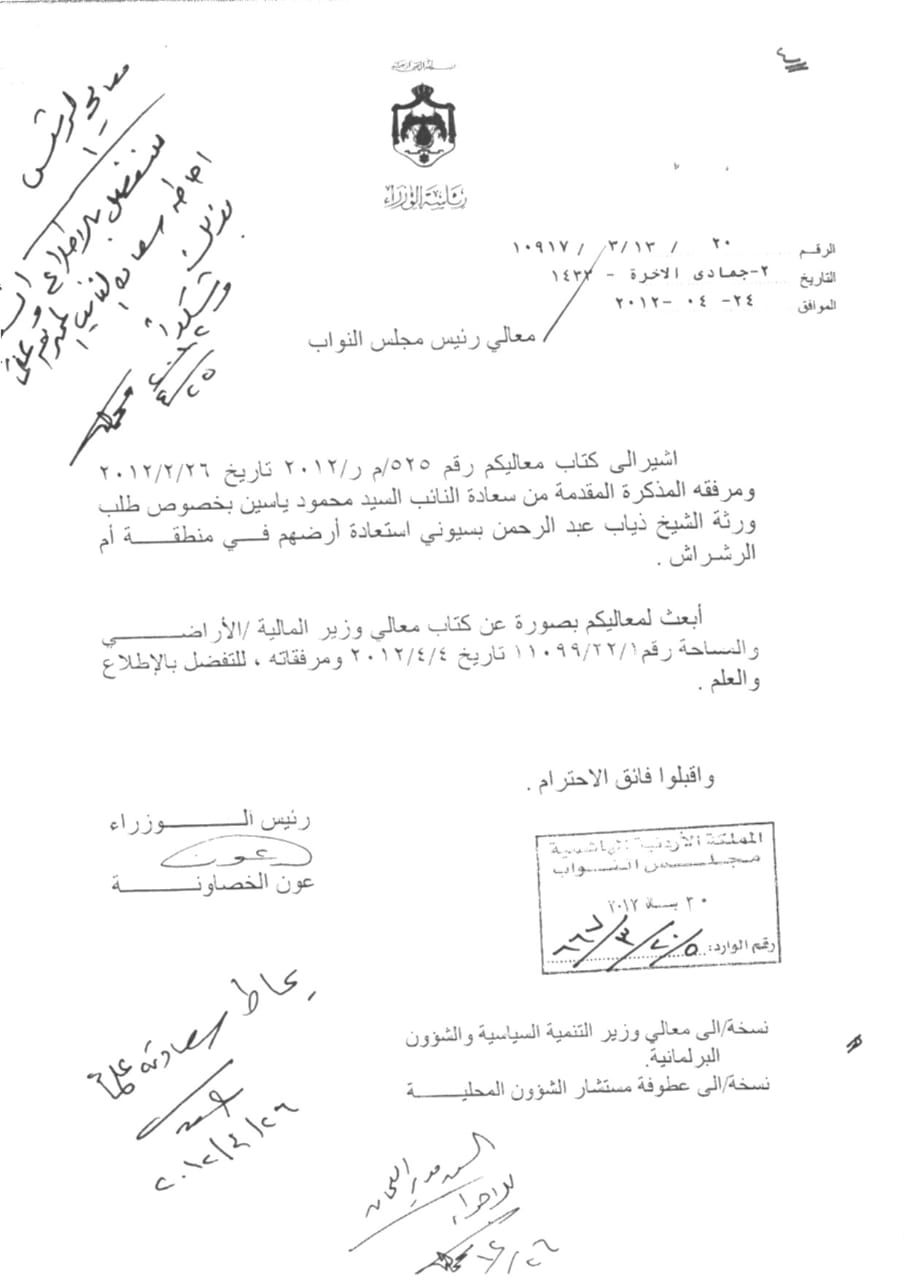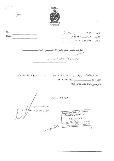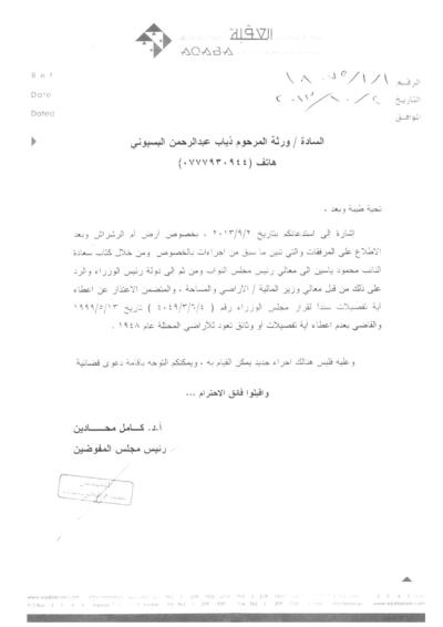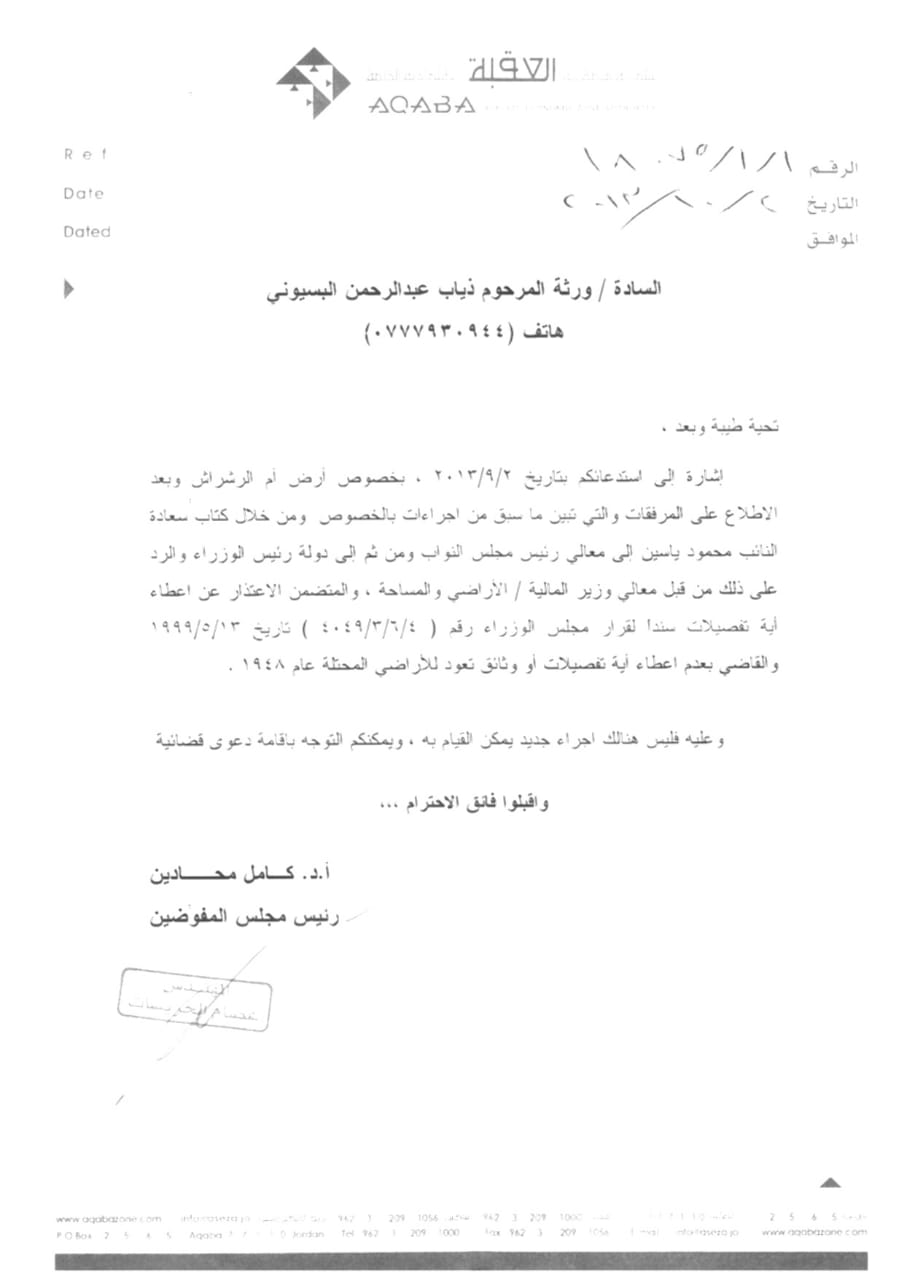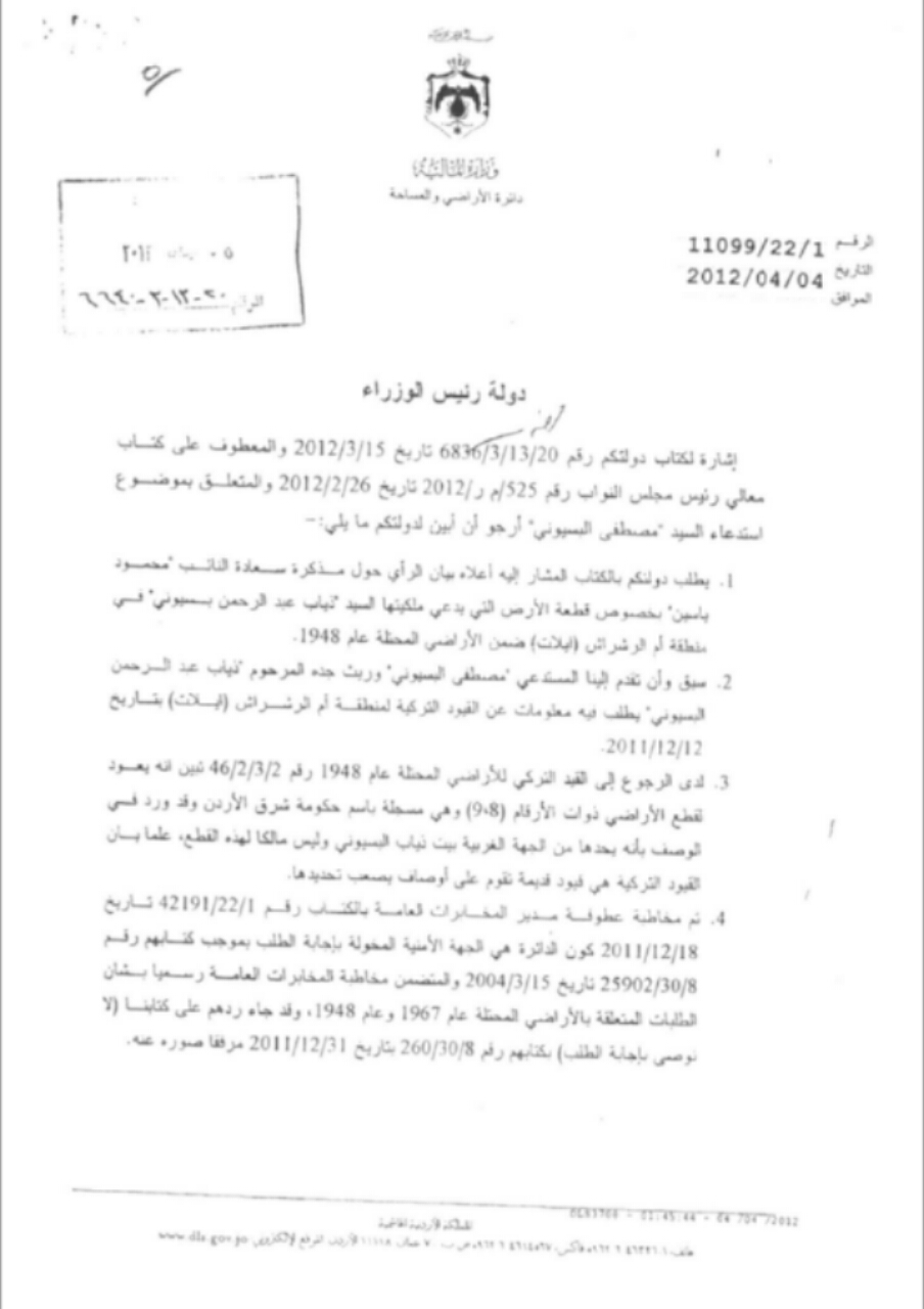ومنذ السنوات الماضية عائلة البسيوني تخاطب الحكومة خاصة دائرة الأراضي والمساحة لاثبات حقهم وملكيتهم بهذه الاراضي، دون استجابة بحجة "أنها محمية من الجهات الامنية الاردنية".