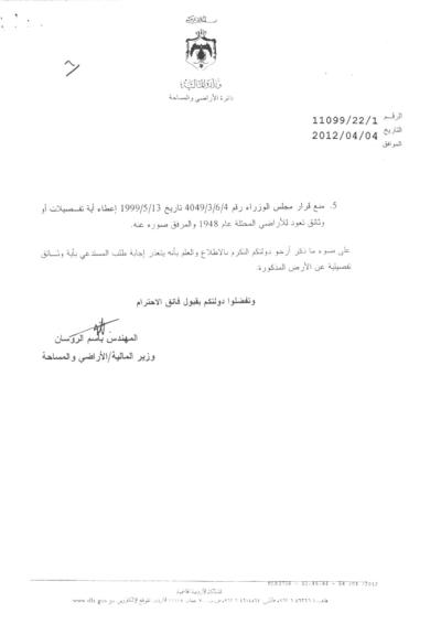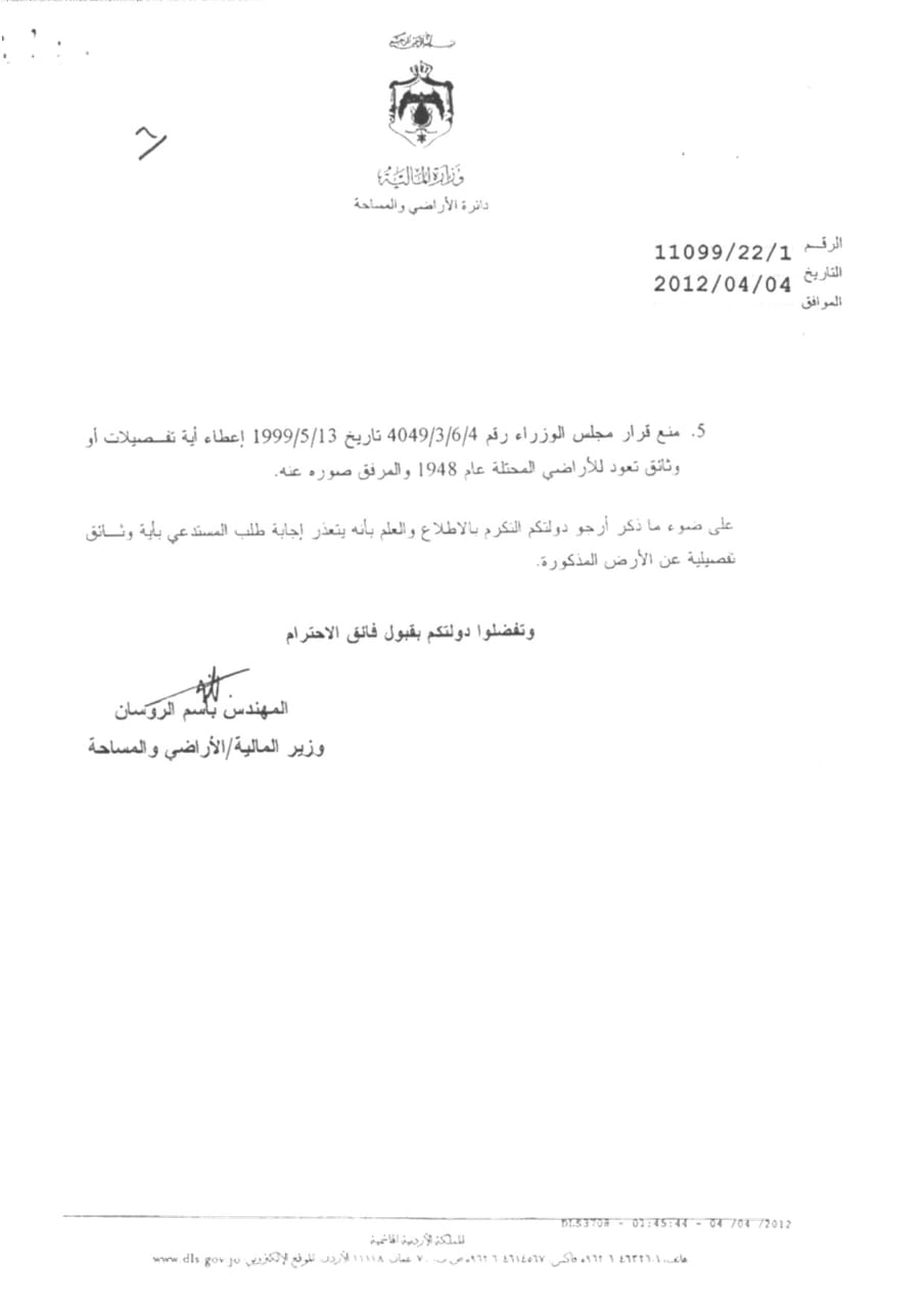 الناطق الاعلامي باسم مديرية الاراضي والمساحة طلال بني صخر يوضح "لـ عمان نت" بان المديرية لديها قسم خاص معني بالشؤون الفلسطينيه، ويوجد فيه قيود لأراضي مملوكة في فلسطين منذ عام 48 أو67 في الضفة الغربية .