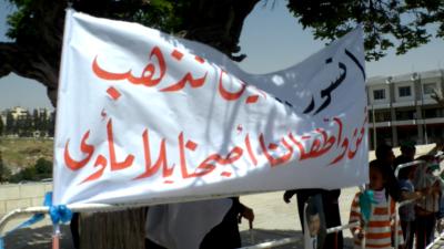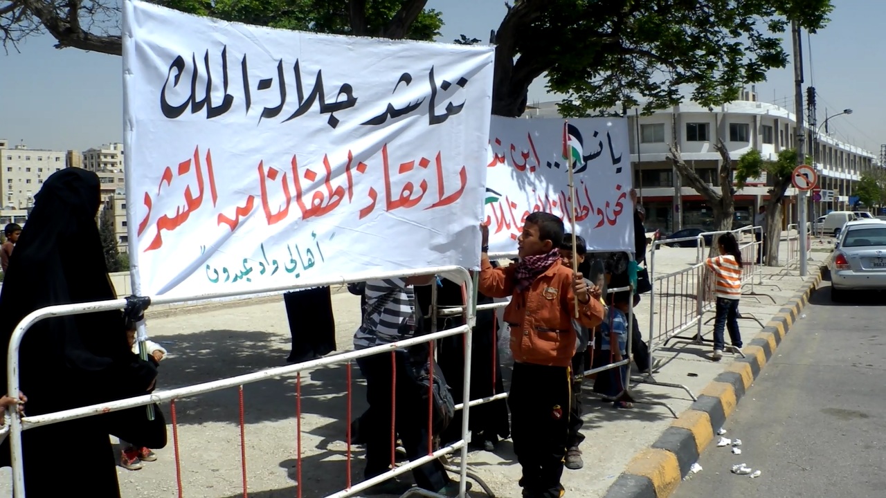 ورفع المعتصمون شعار "لا لتشريد الاطفال" و "ننشاد جلالة الملك بحماية أطفالنا من التشرّد".