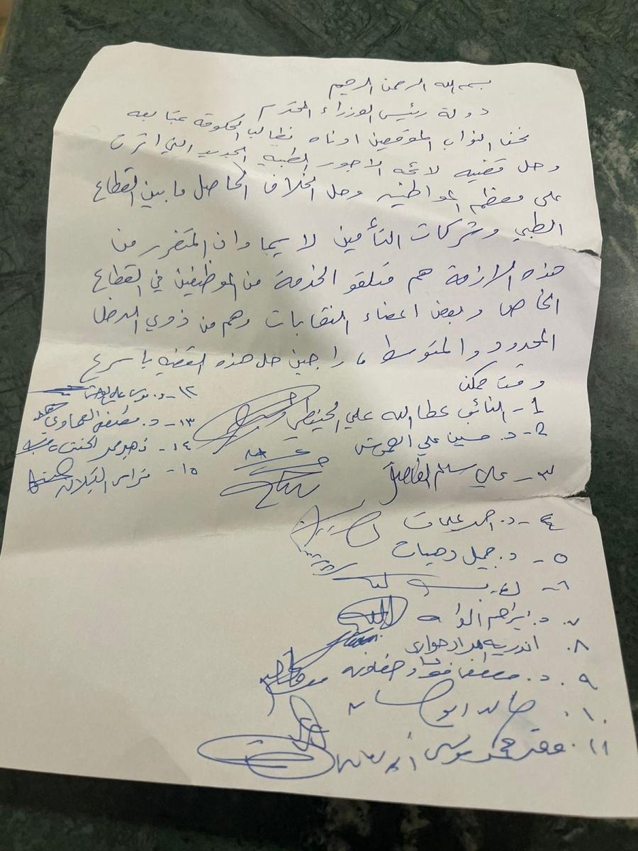 والمذكرة تطالب حسان بحل قضية لائحة الأجور الطبية التي أشعلت خلافا بين نقابة الأطباء وشركات التأمين ومزودي الخدمة الطبية.