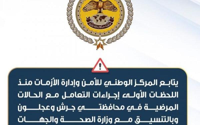 أكد المركز الوطني للأمن وإدارة الازمات أنه يتابع منذ اللحظات الأولى إجراءات التعامل مع الحالات المرضية في محافظتي جرش وعجلون وبالتنسيق مع وزارة الصحة والجهات ذات العلاقة.