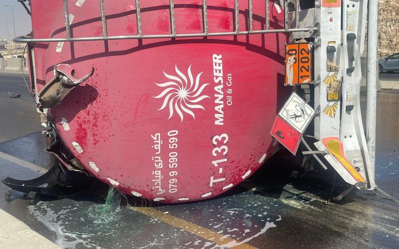 تتعامل الدوريات الخارجية مع حادث تدهور لمركبة شحن ( صهريج) محمل بإحدى المشتقات النفطية على طريق المطار مقابل جامعة الاسراء باتجاه عمان ، نجم عن الحادث اصابة متوسطة ويوجد إعاقة للطريق وتسريب للحمولة حيث جرى تحويل التسريب الى أحد مجاري التصريف خارج حرم الشارع العام .