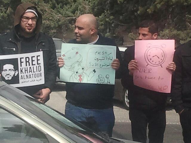 اعتصم ناشطون ظهر الخميس امام المركز الوطني لحقوق الانسان استنكارا لما اعتبروه تقصيرا من المركز ازاء قضية الناشط خالد الناطور المعتقل لدى السلطات السعودية منذ 54 يوماً.