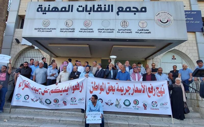 اعتصم عشرات المواطنين والناشطين الحزبيين، مساء الأحد، أمام مجمع النقابات المهنية في العاصمة عمان، احتجاجا على قرارات الحكومة المتتالية برفع أسعار السلع والتي كان آخرها رفع أسعار المحروقات.