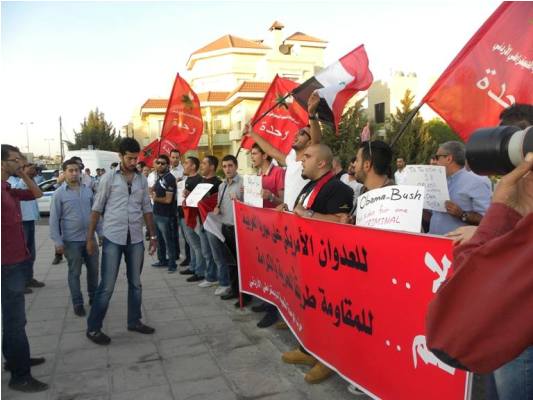 نفذ ﺍﻟﻤﻠﺘﻘﻰ ﺍﻟﻮﻃﻨﻲ ﺍﻟﺸﺒﺎﺑﻲ ﻟﺮﻓﺾ ﺍﻟﻌﺪﻭﺍﻥ ﺍﻷﻣﺮﻳﻜﻲ ﻋﻠﻰ ﺳﻮﺭﻳة اعتصاما مساء الاثنين أمام مبنى السفارة الأمريكية، وانتقلوا بعد ذلك للاعتصام في منطقة اللويبدة، وذلك بالتزامن ﻣﻊ ﺟﻠﺴﺔ ﺍﻟﻜﻮﻧﻐﺮﻳﺲ ﺍلأﻣﺮﻳﻜﻲ ﻟﻠﺘﺼﻮﻳﺖ ﻋﻠﻰ ﻣﺸﺮﻭﻉ ﻗﺮﺍﺭ الضربة العسكرية ضد ﺳﻮرية.