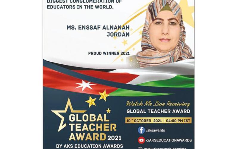 حصلت المعلمة الأردنية من مدرسة فاطمة الزهراء الاساسية للبنات في محافظة الطفيلة إنصاف النعانعة على جائزة المعلم العالمي لعام 2021 من بين 26 ألف مرشح للجائزة.