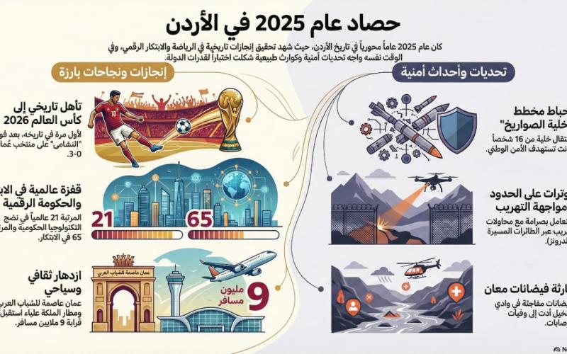 رغم غياب الأحداث السياسية الكبرى على الساحة الداخلية خلال عام 2025، إلا أن المشهد الأردني تأثر بشكل ملحوظ بتطورات أمنية متسارعة وتداعيات إقليمية ودولية انعكست على مختلف المستويات السياسية والاقتصادية والاجتماعية.