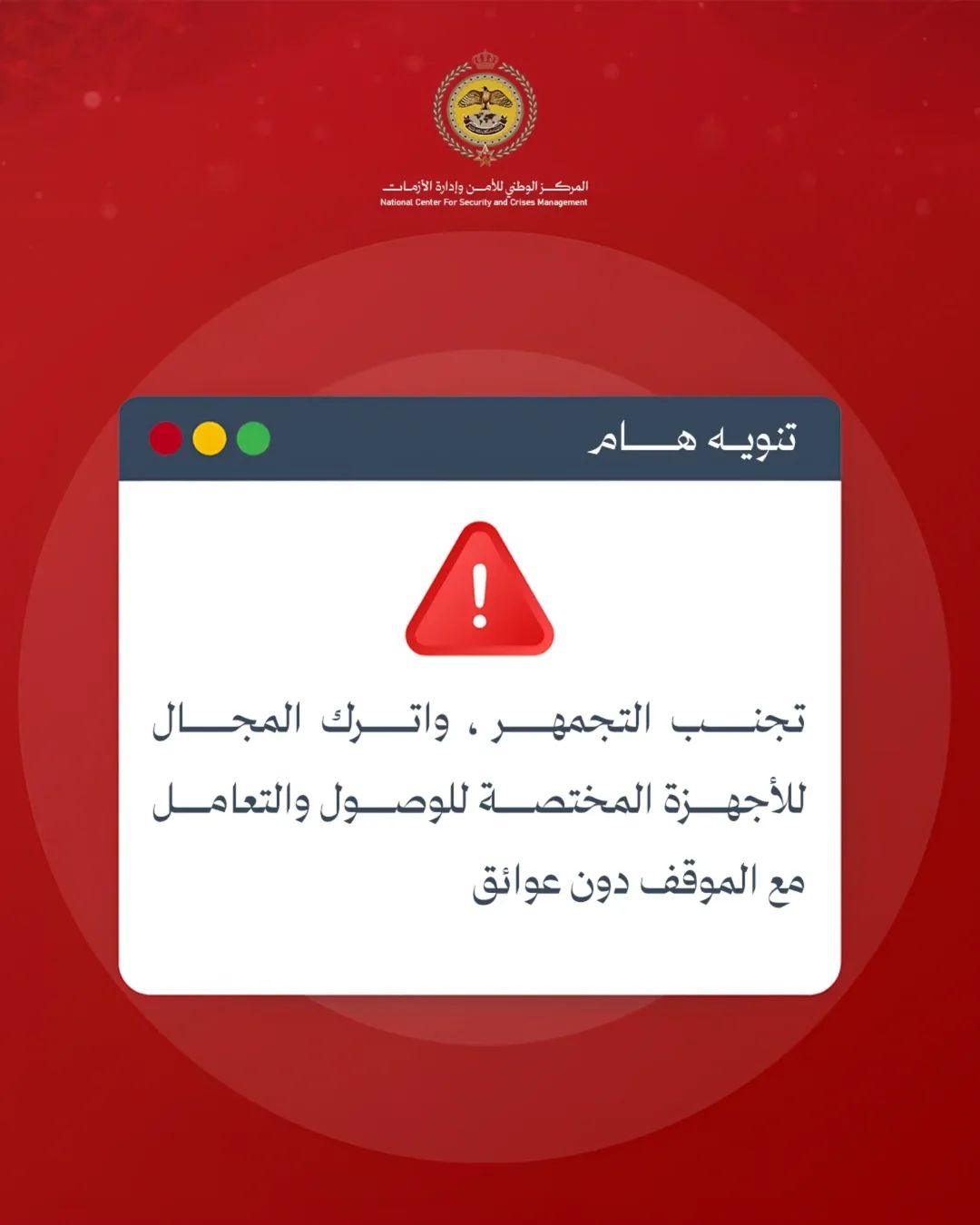 ودعت مديرية الأمن العام على ضرورة بقاء المواطنين داخل مناطق تواجدهم وتجنب المناطق المفتوحة الخارجية اثناء فترات اطلاق صافرات الانذار ولحين اعلان انتهائها.