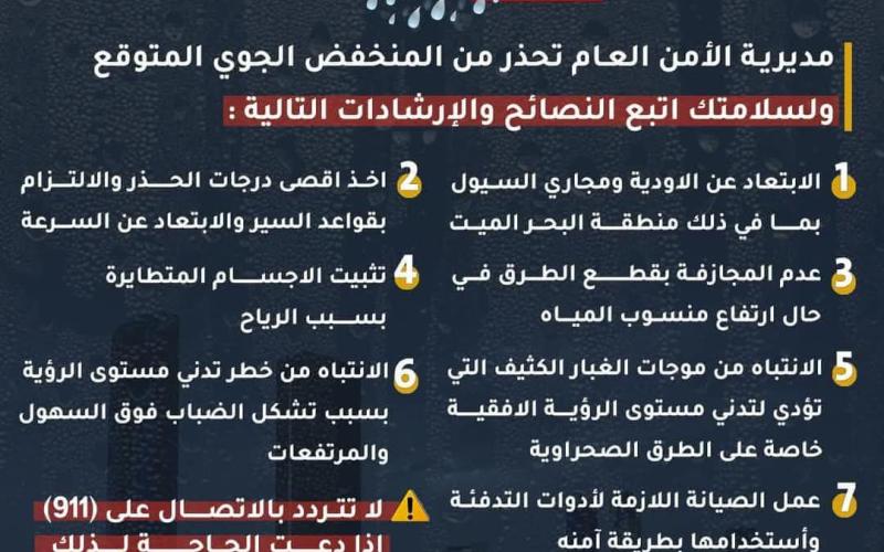 كما اطّلعت وزارة الإدارة المحلية على تقارير دائرة الأرصاد الجوية والخرائط الجوية الواردة إليها بموجب اتفاقية نظام الإنذار المبكر، التي تشير إلى منخفض جوي من المتوقع أن يؤثر على جميع مناطق المملكة الخميس، ترافقه أمطار رعدية غزيرة في عدد من المناطق.