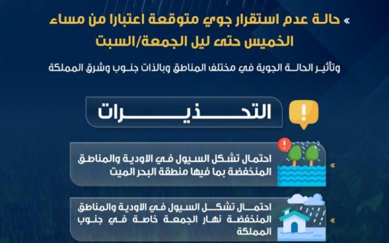 حذر المركز الوطني للأمن وإدارة الازمات من حالة عدم الاستقرار الجوي المتوقعة اعتبارا من مساء الخميس حتى ليل الجمعة/السبت، وتأثيرها في مختلف المناطق وبالذات جنوب وشرق المملكة.
