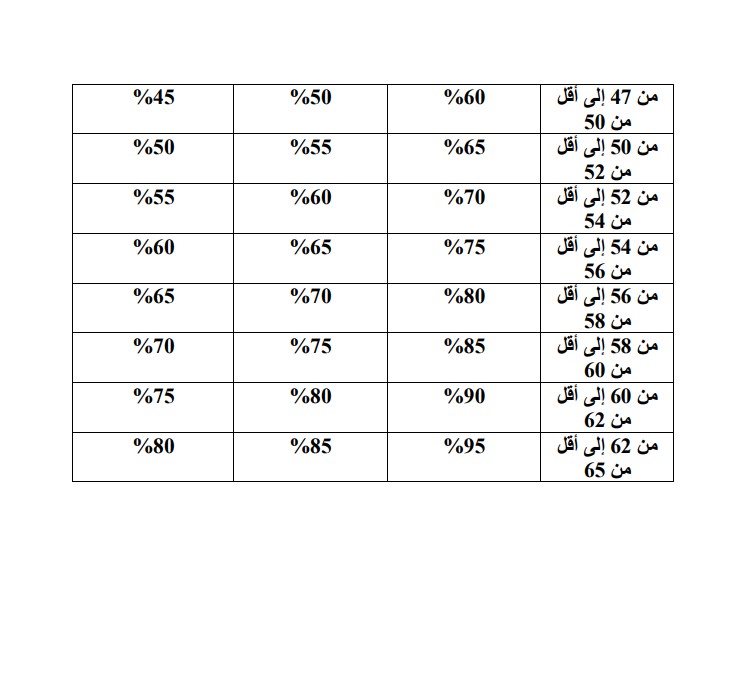 ي-لمجلس الوزراء بناء على تنسيب وزير الدفاع أو وزير الداخلية حسب مقتضى الحال الاستمرار بشمول المؤمن عليه العسكري بأحكام هذا القانون والذي أكمل المدة الموجبة لاستحقاق راتب التقاعد الوجوبي في الخدمة العسكرية وذلك خلال مدة ستة أشهر من تاريخ إكمال سن (60) للذكر أو سن (55) للأنثى، وحتى سن (65) للذكر وسن (60) للأنثى وفي هذه الحالة يحسب راتب التقاعد الوجوبي وفقا لأحكام الفقرة (ج) من هذه المادة مع تعديل معامل المنفعة وفقا لأحكام الجدول رقم (6) الملحق بهذا القانون.