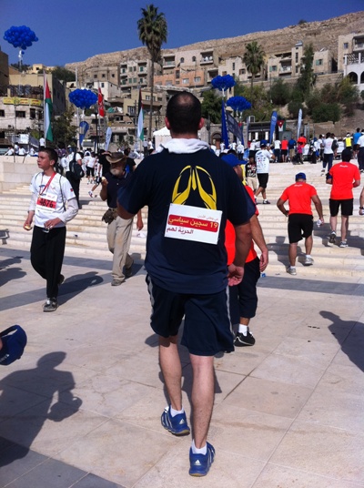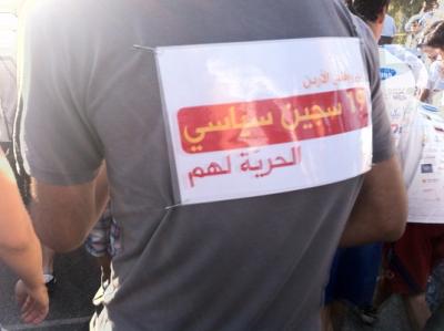 قام عدد من المشاركين في ماراثون عمان الدولي الذي انطلق صباح الجمعة، بارتداء قمصاناً تحمل شعارات تطالب بالإفراج عن المعتقلين .