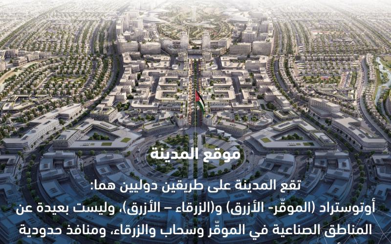 أكدت رئاسة الوزراء أن المدينة الجديدة تقع على طريقين دوليين هما، أوتوستراد (الموقّر-الأزرق) و(الزرقاء-الأزرق) وليست بعيدة عن المناطق الصناعية في الموقّر وسحاب والزرقاء، ومنافذ حدودية أساسية مثل حدود العمري وحدودنا مع العراق.