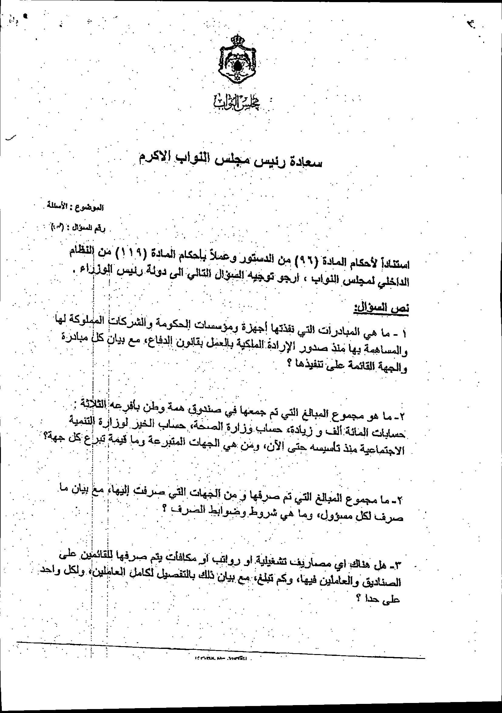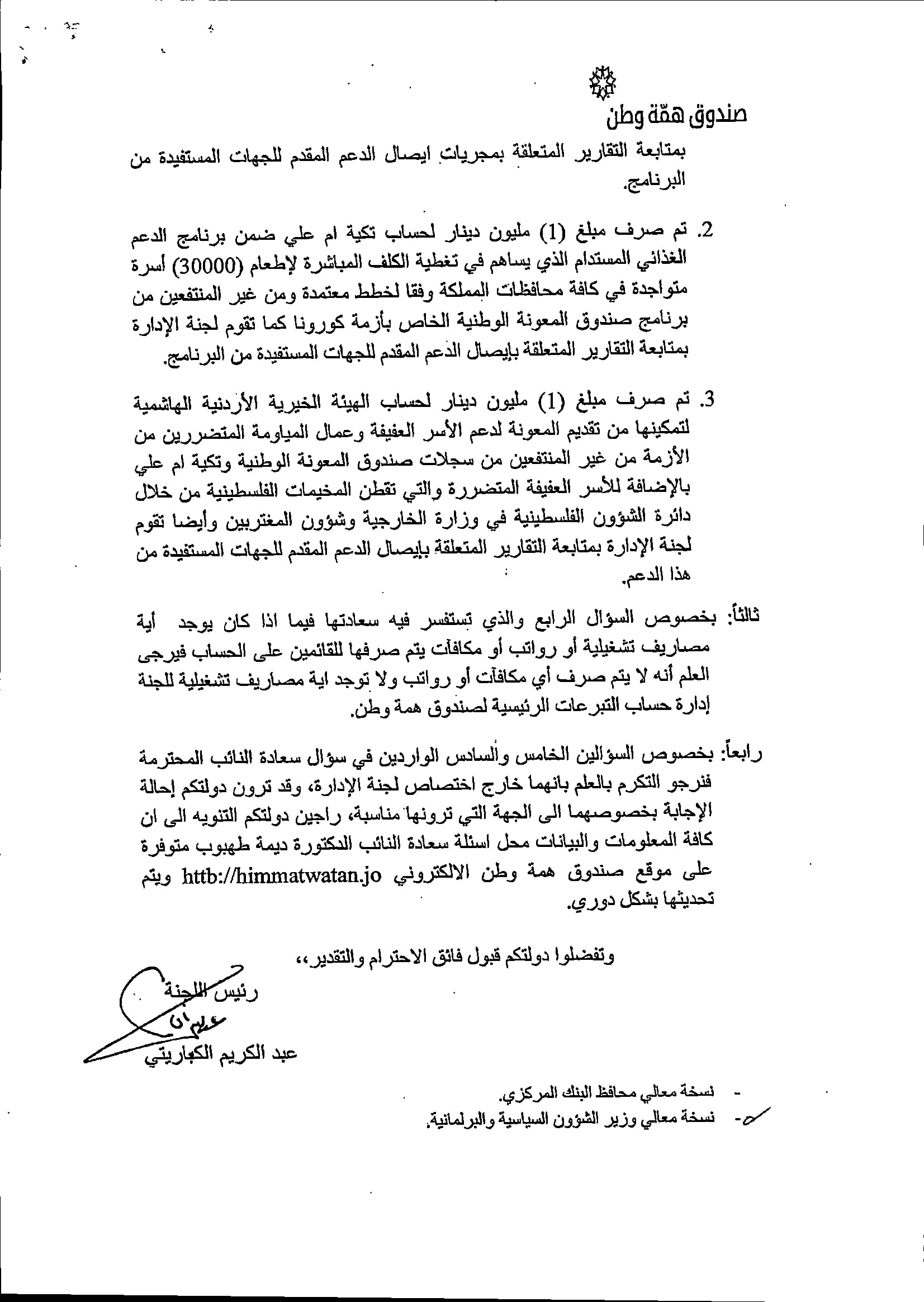 وأجاب الكباريتي ردا على سؤال طهبوب انه لا يتم صرف اي مكافآت او رواتب ولا توجد اي مصاريف تشغيلية للجنة ادارة حساب التبرعات لصندوق همة وطن.