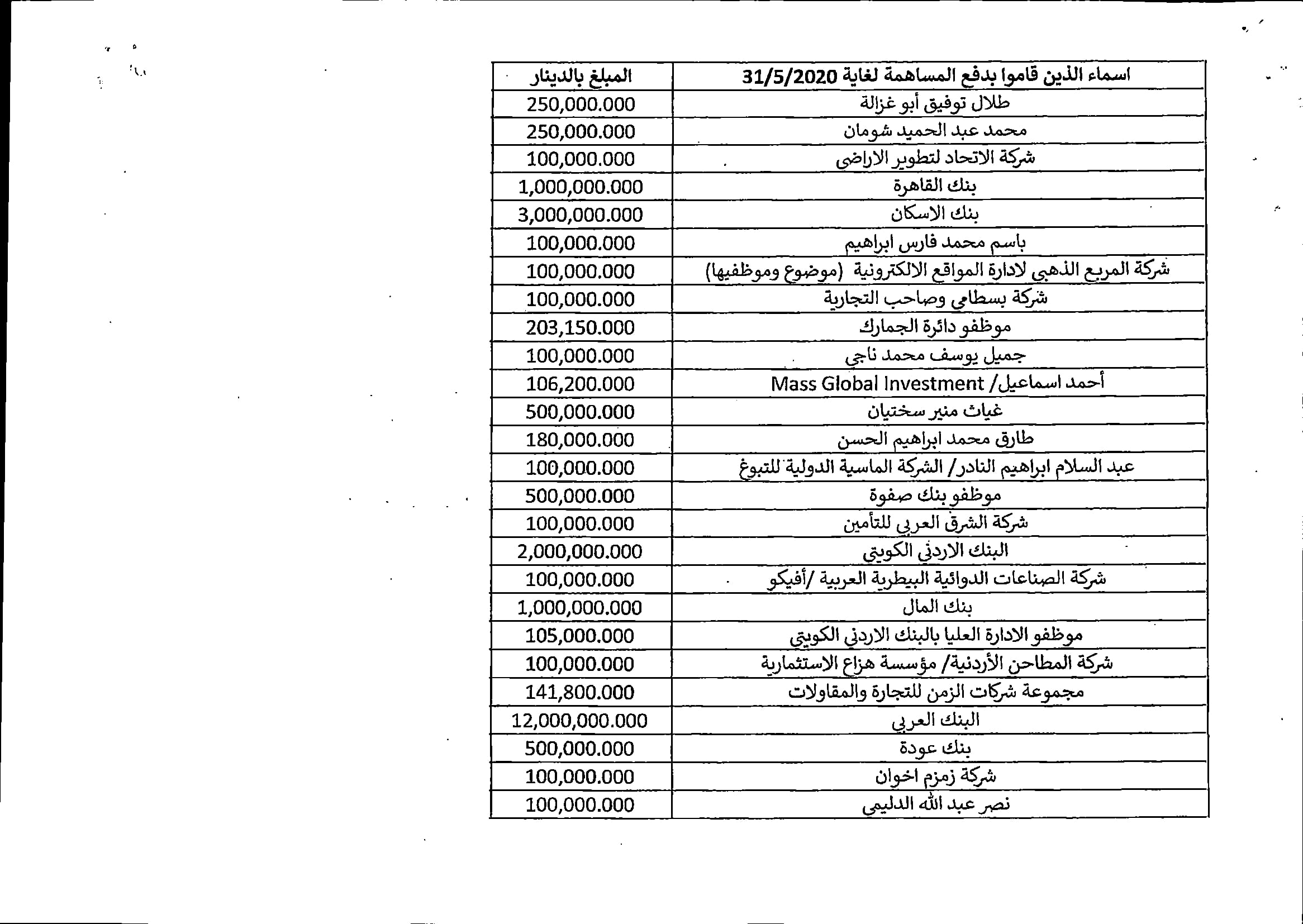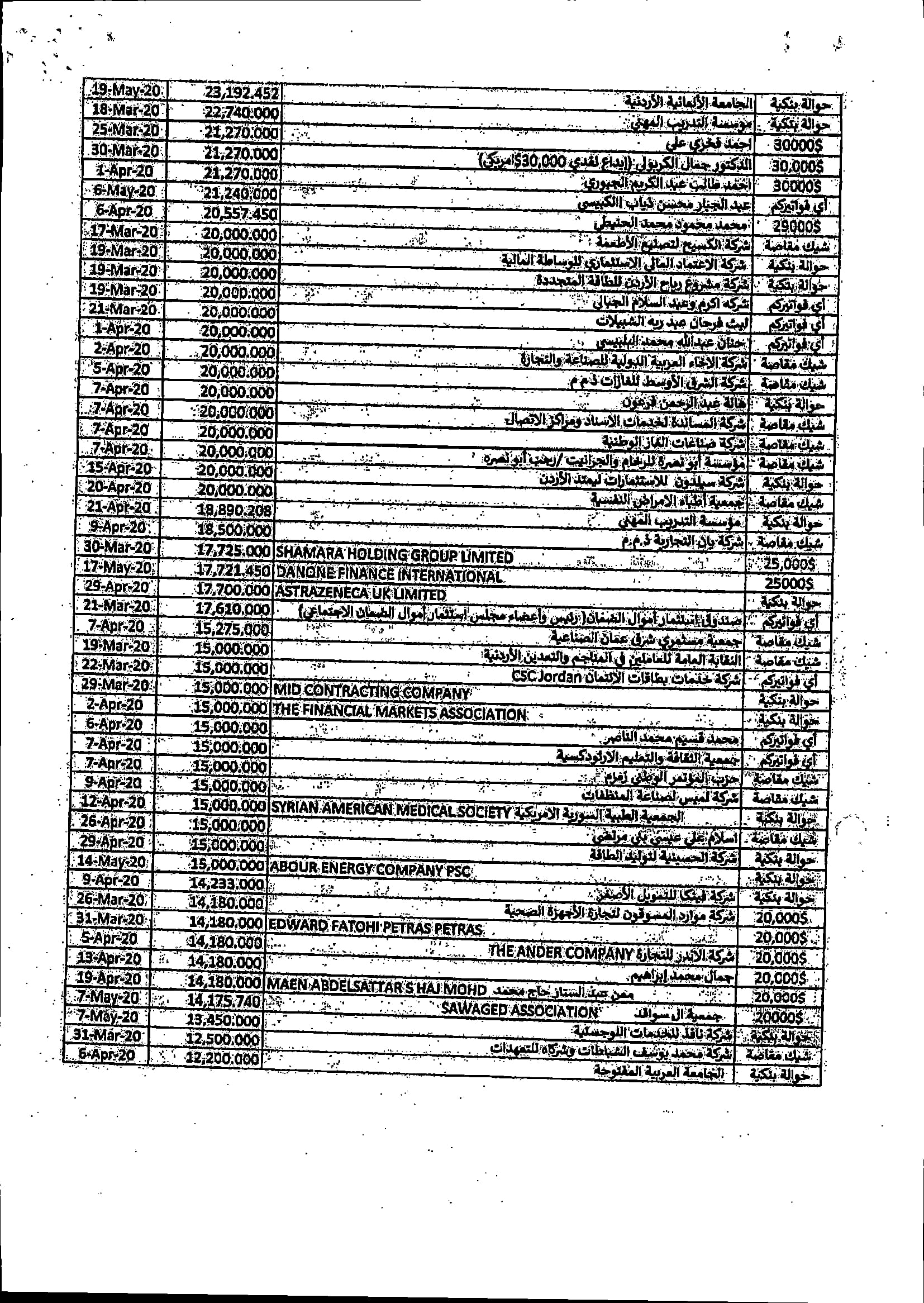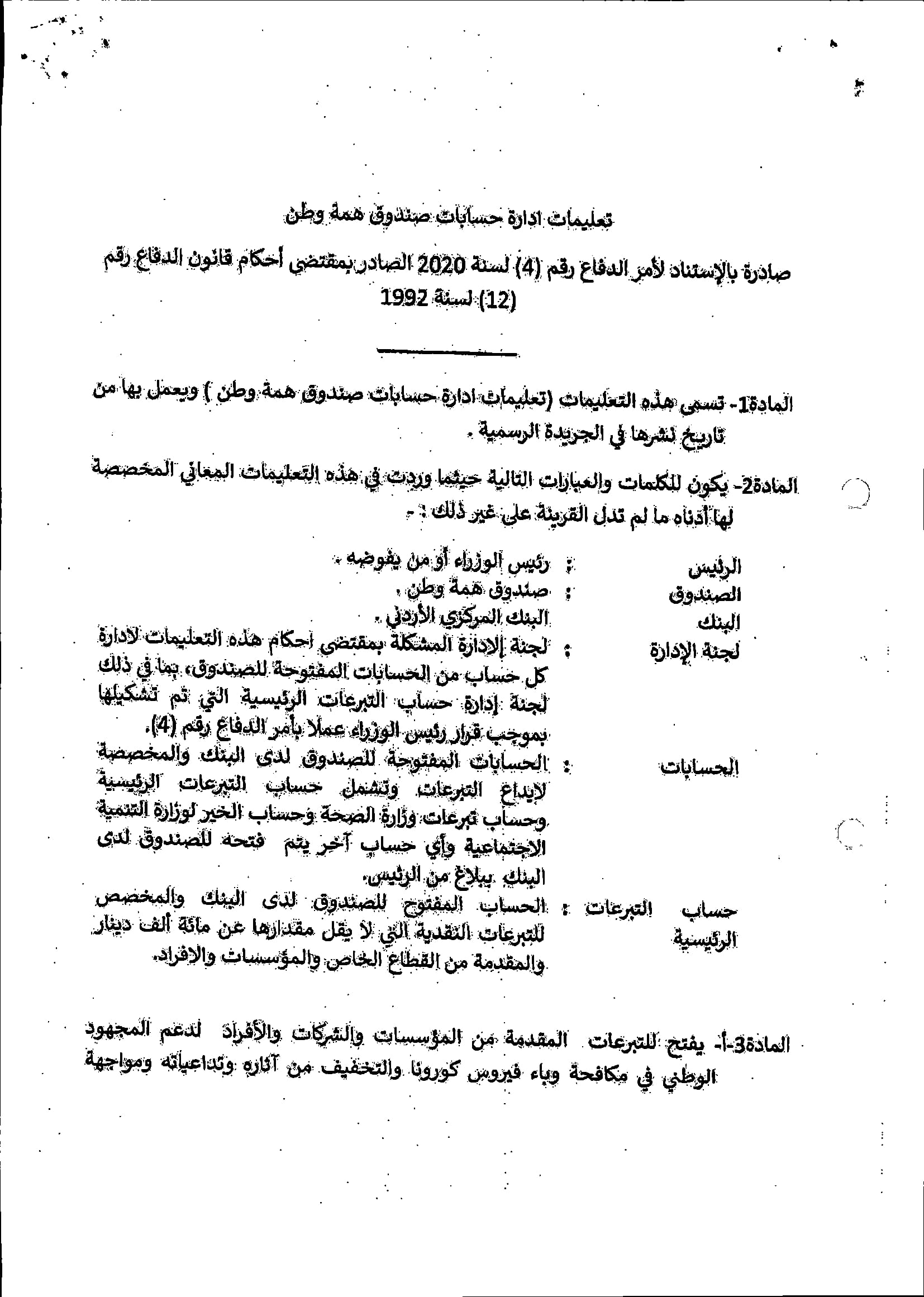 وأكد رئيس لجنة صندوق همة وطن عبد الكريم الكباريتي، أن مجموع التبرعات للصندوق لغاية ٣١-٥-٢٠٢٠ بلغت ٨٦٣٦٩٣٤٦ دينارا بالاضافة الى التزامات من متبرعين بقيمة ٦٩٥٥٢٥١ دينارا، كاشفا بثماني صفحات أسماء المتبرعين للصندوق.