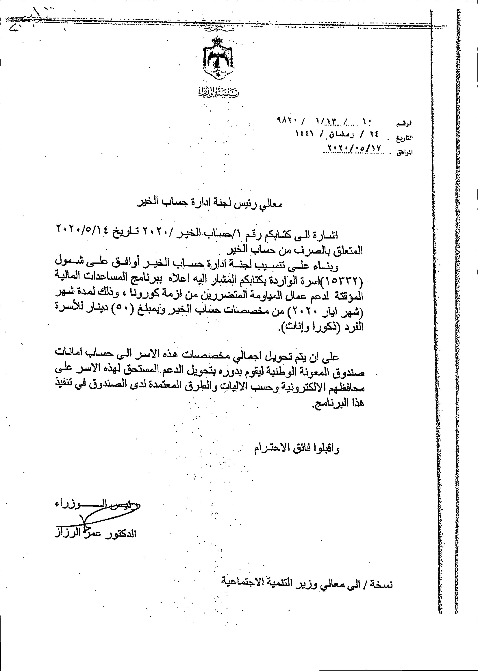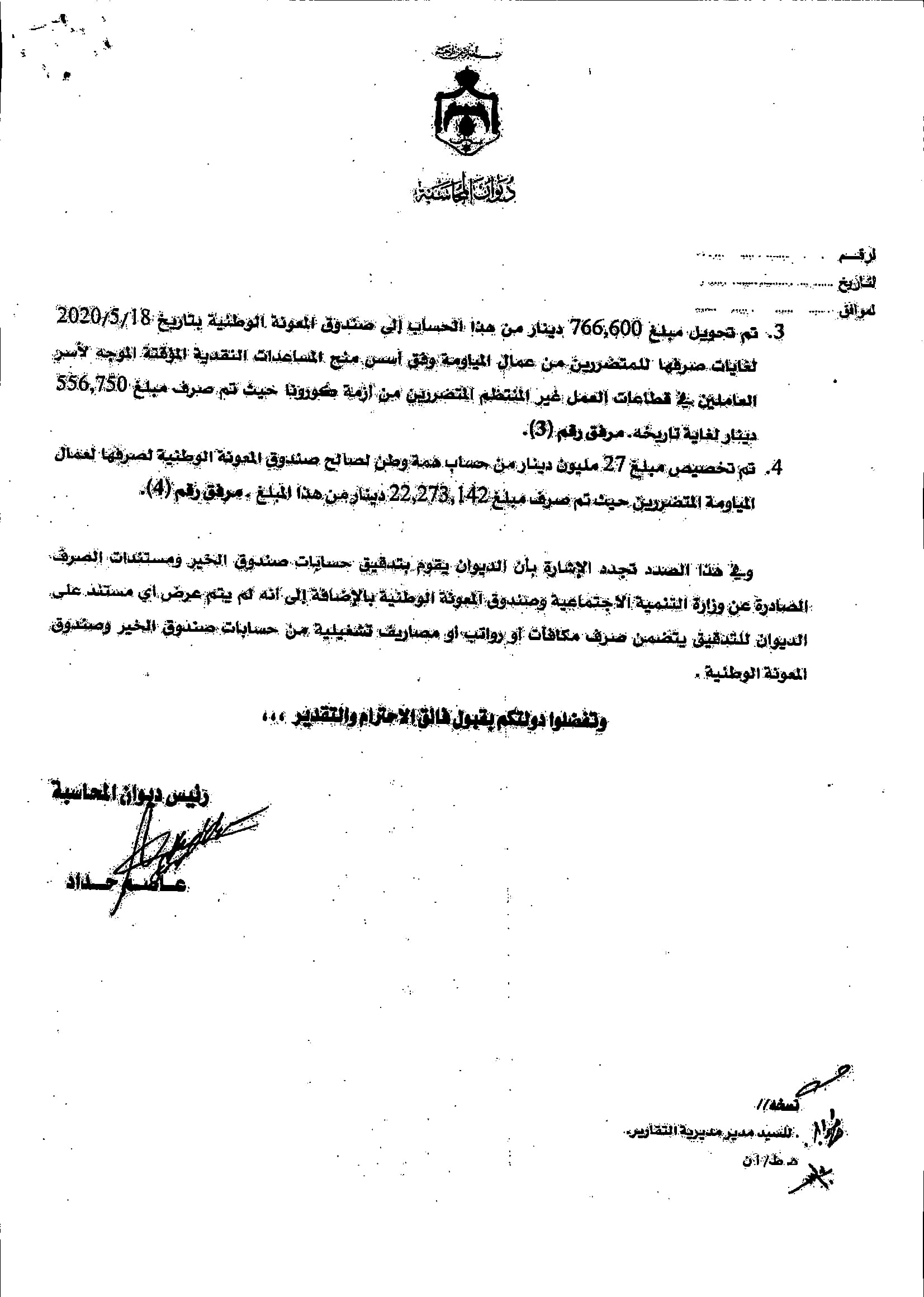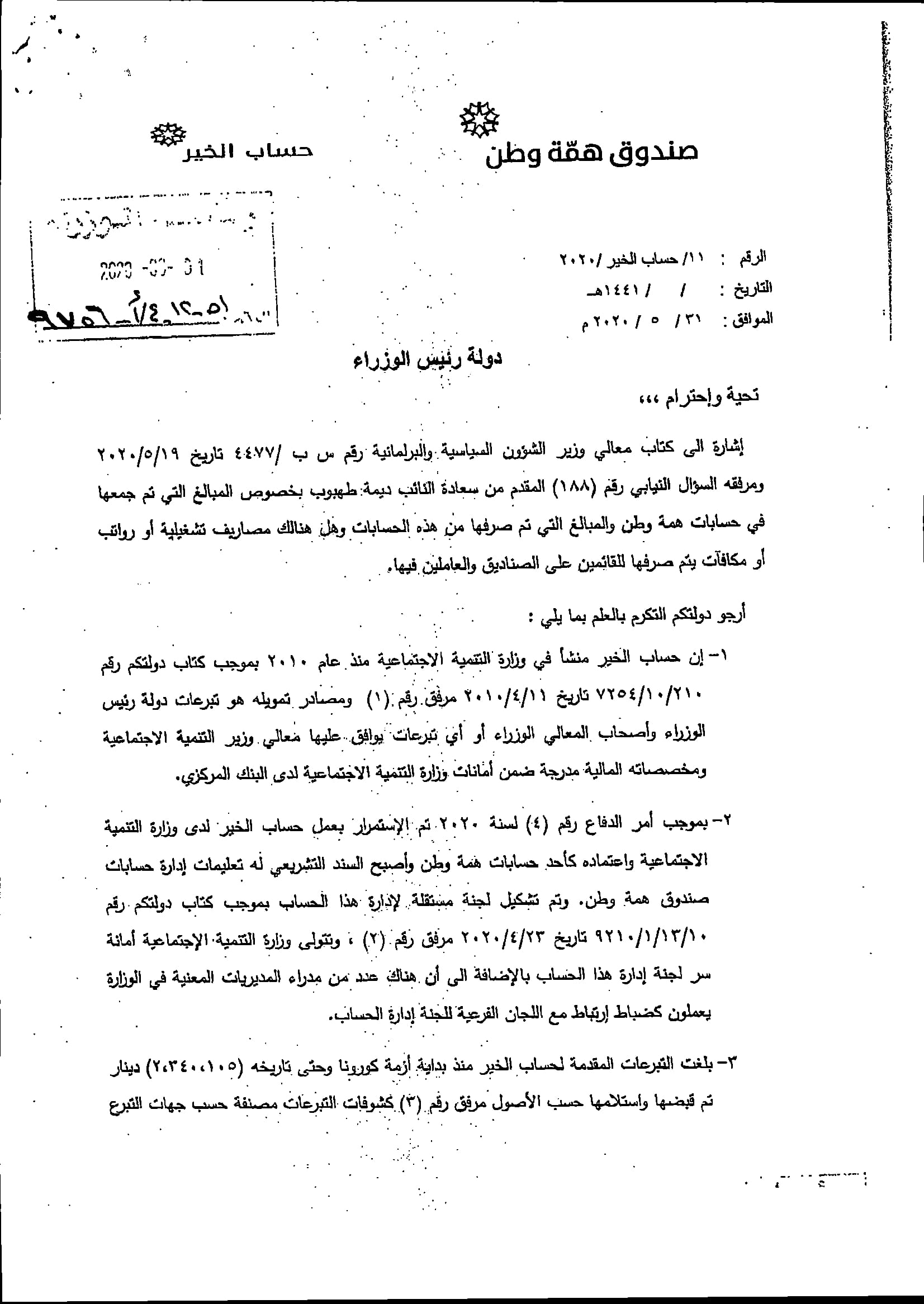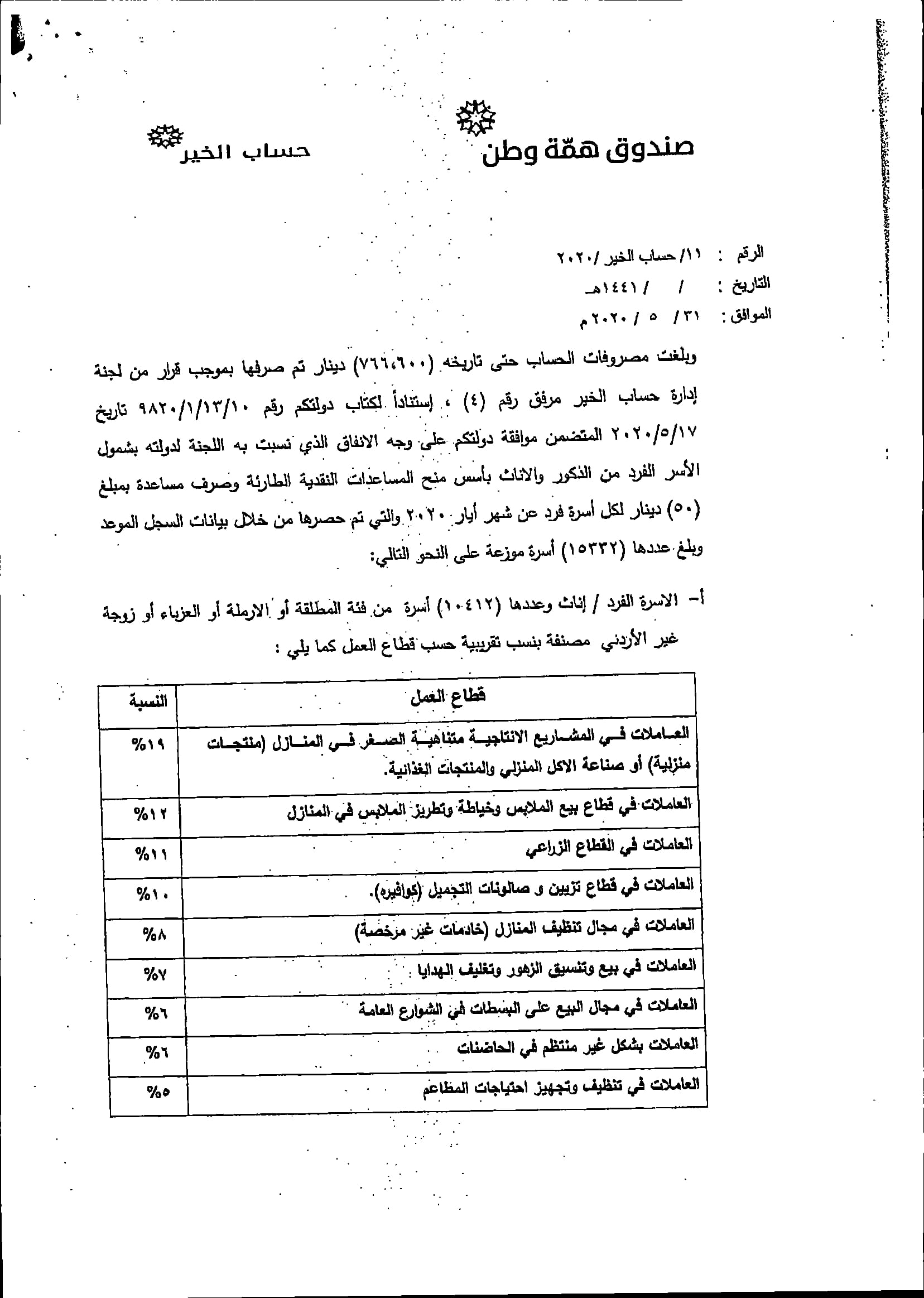 أما عن قيمة التبرعات المقدمة لحساب الخير منذ بداية ازمة كورونا فبلغت ٢٣٤٠١٠٥ دينار تم استلامها بكشوفات تبرع، اما المصروفات فبلغت ٧٦٦٦٠٠ دينار تم صرفها بقرار من لجنة ادارة الحساب تم الموافقة عليه من رئاسة الوزراء بصرف مساعدات نقدية عاجلة بمبلغ ٥٠ دينار لكل أسرة فرد من الذكور والاناث عن شهر أيار ٢٠٢٠ و تم حصرها من خلال السجل الموحد و بلغت ١٥٣٣٢ أسرة.