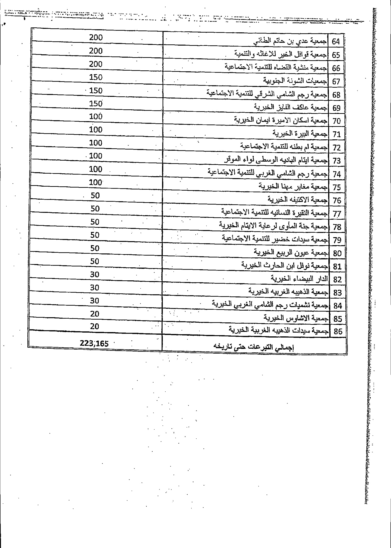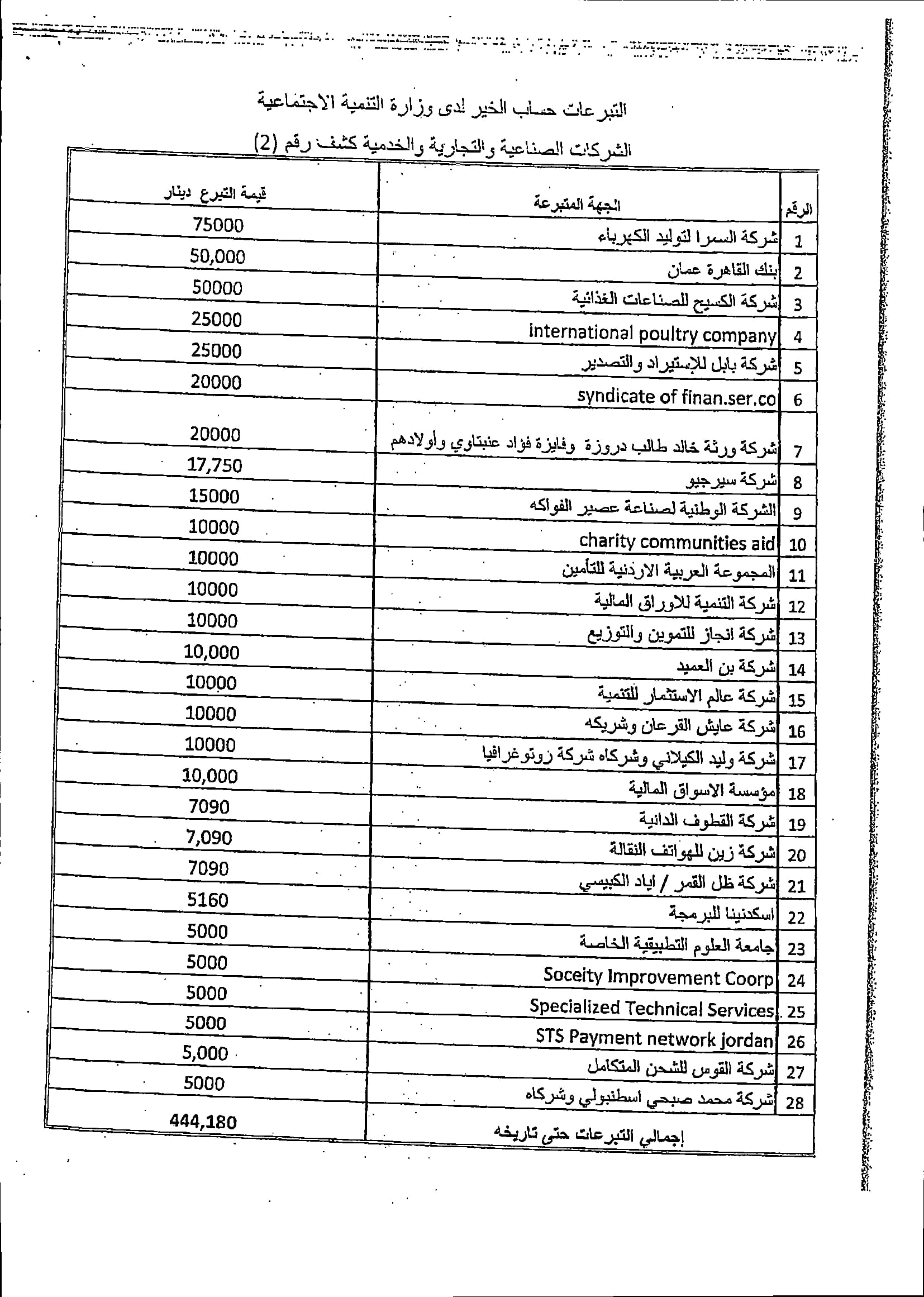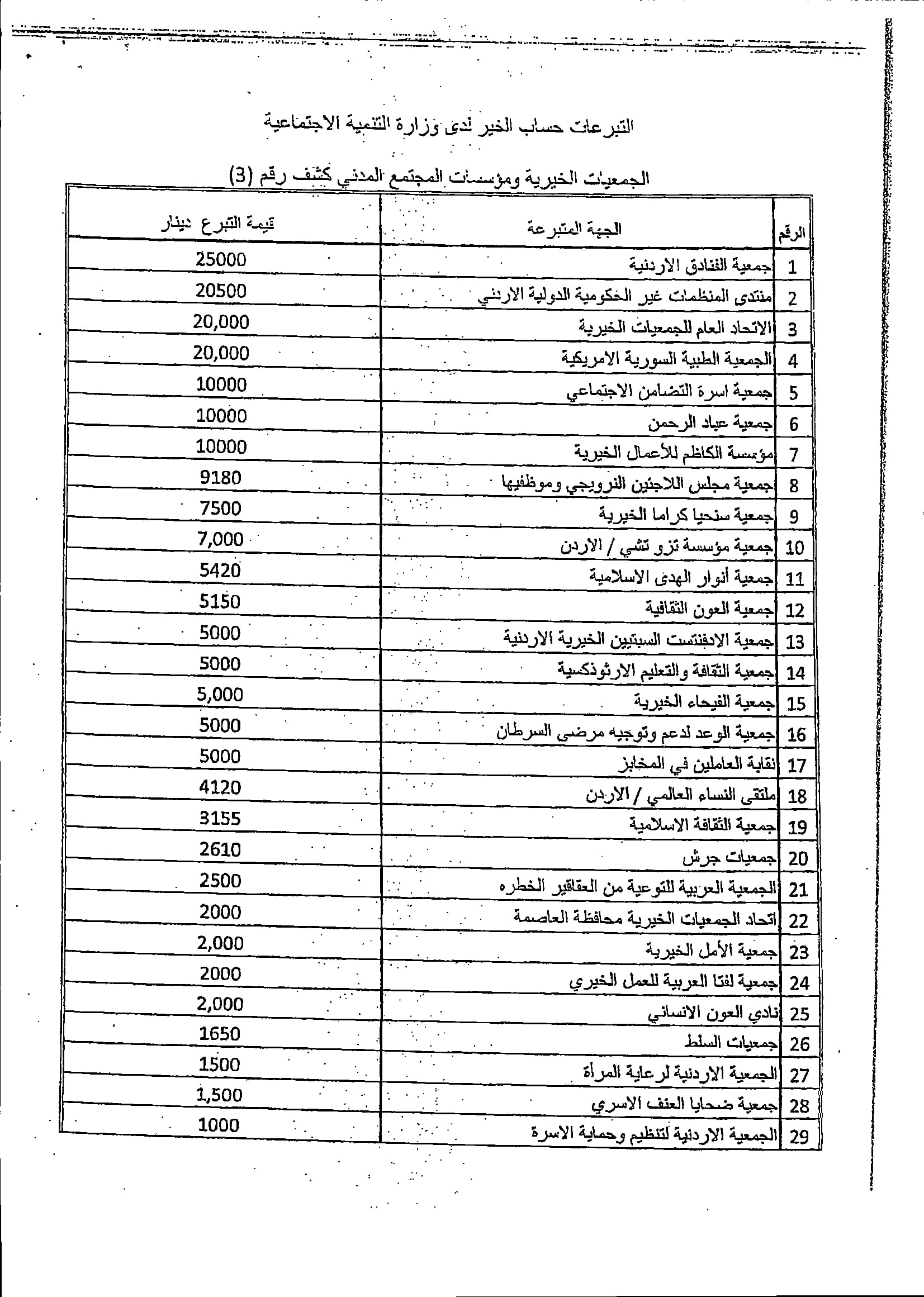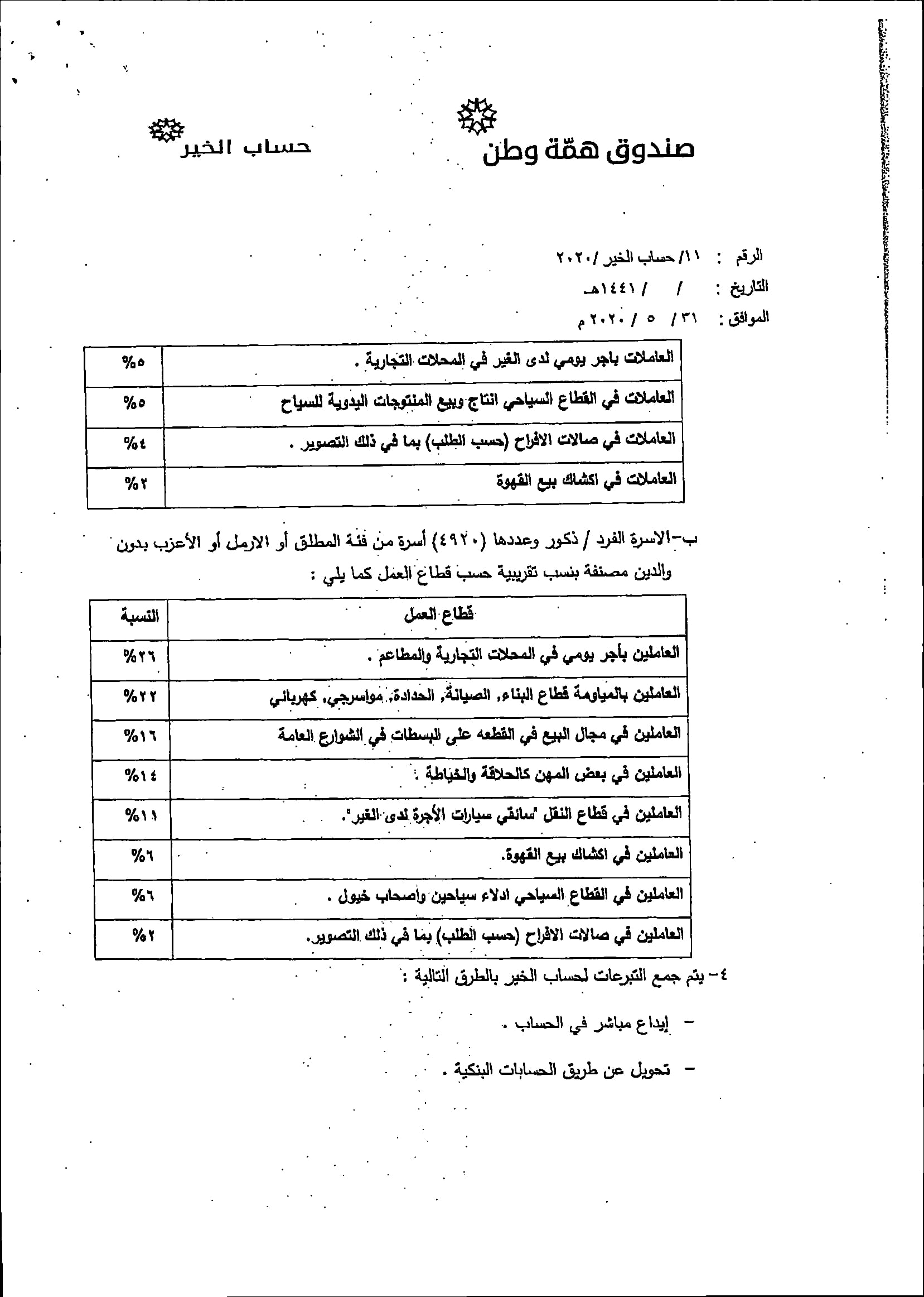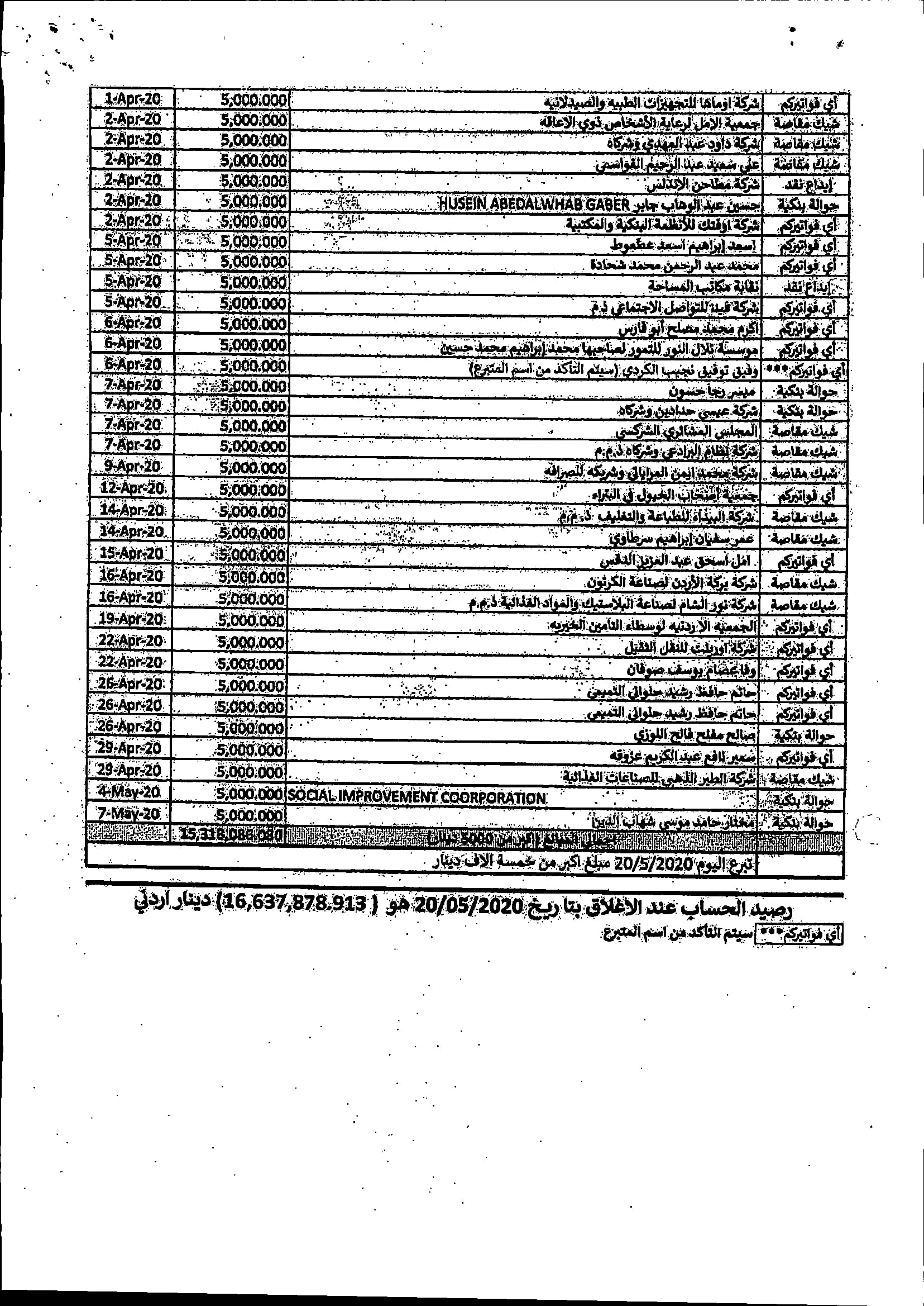 أما عن قيمة التبرعات المقدمة لحساب الخير منذ بداية ازمة كورونا فبلغت ٢٣٤٠١٠٥ دينار تم استلامها بكشوفات تبرع، اما المصروفات فبلغت ٧٦٦٦٠٠ دينار تم صرفها بقرار من لجنة ادارة الحساب تم الموافقة عليه من رئاسة الوزراء بصرف مساعدات نقدية عاجلة بمبلغ ٥٠ دينار لكل أسرة فرد من الذكور والاناث عن شهر أيار ٢٠٢٠ و تم حصرها من خلال السجل الموحد و بلغت ١٥٣٣٢ أسرة.