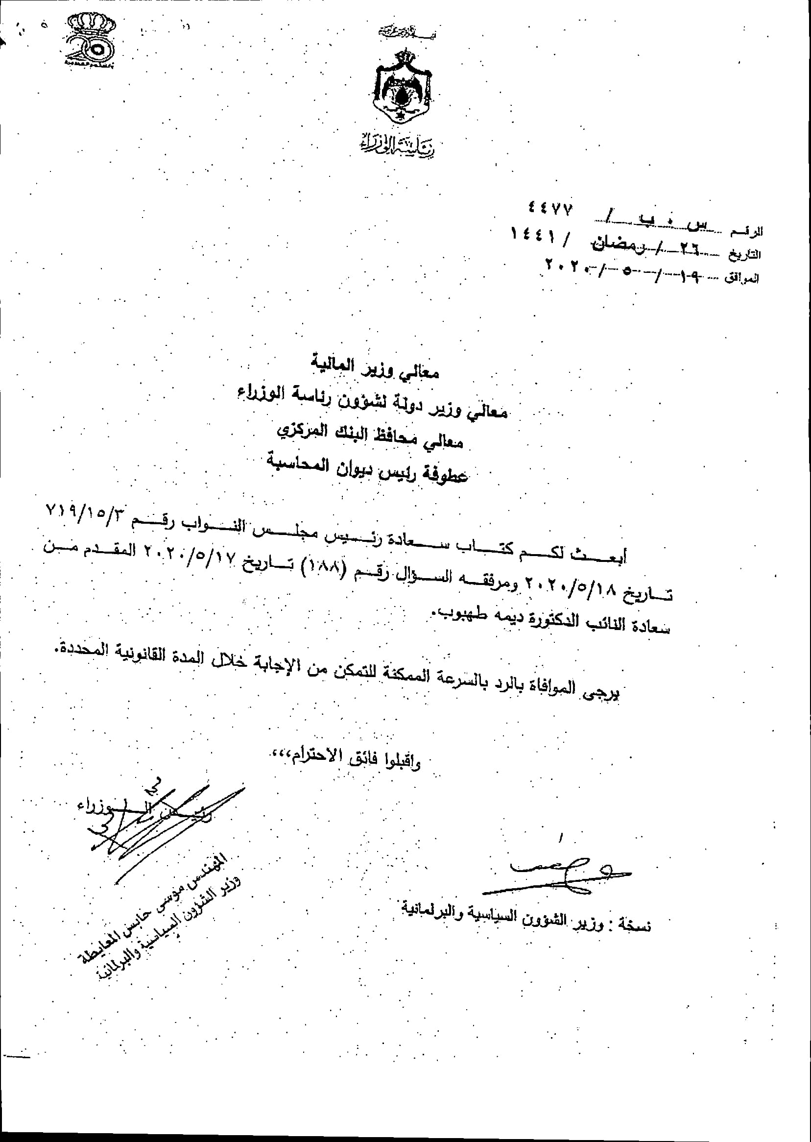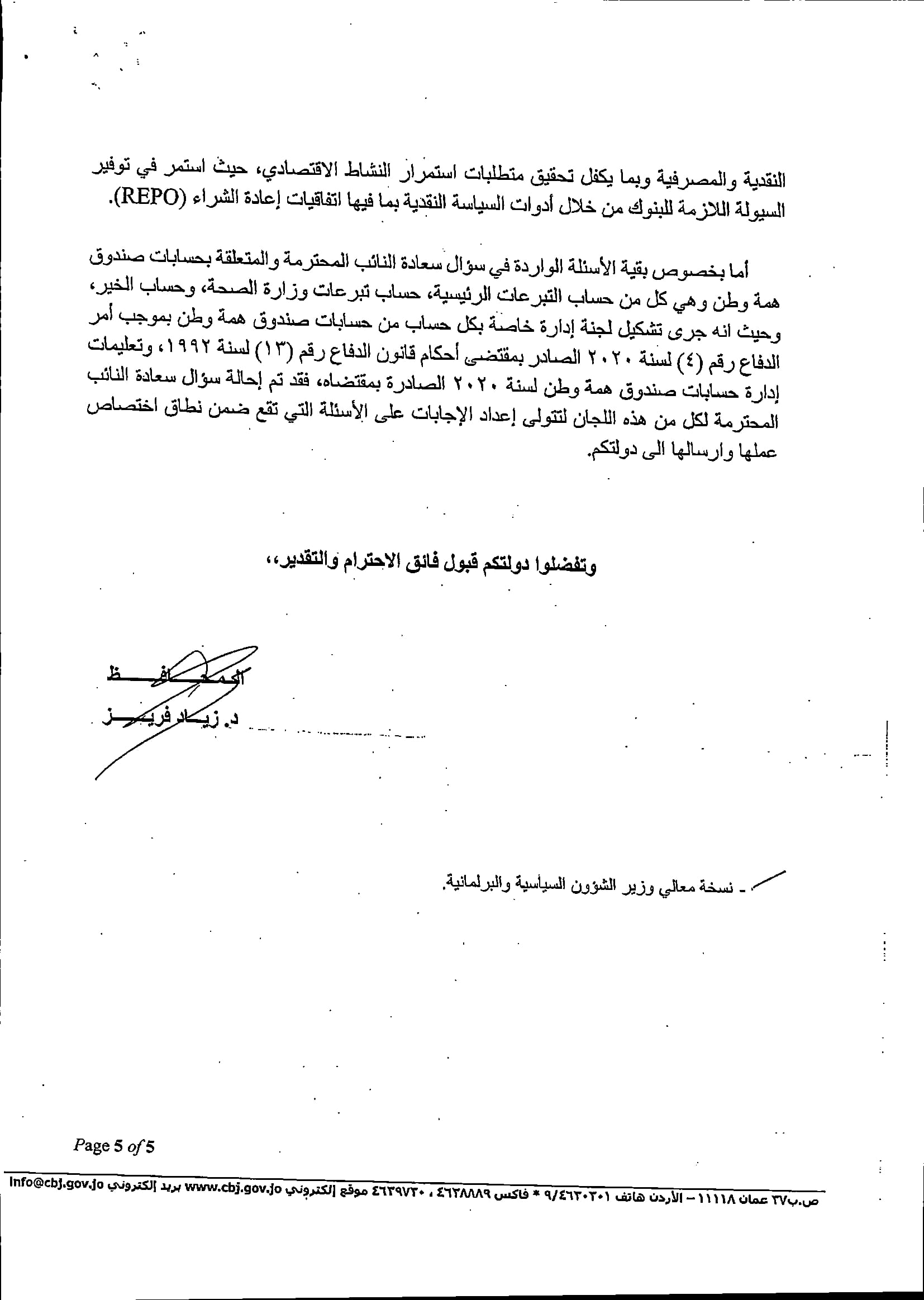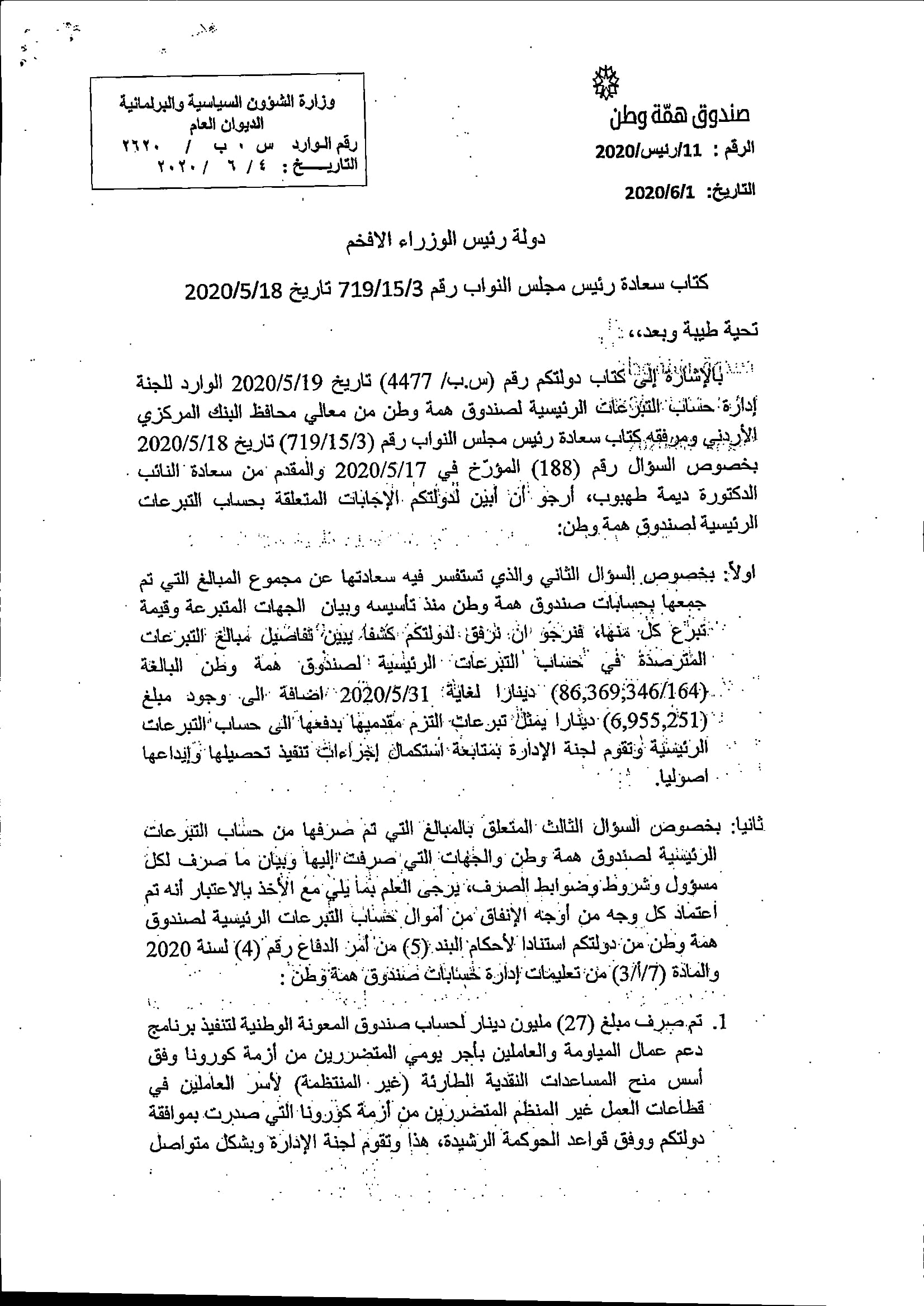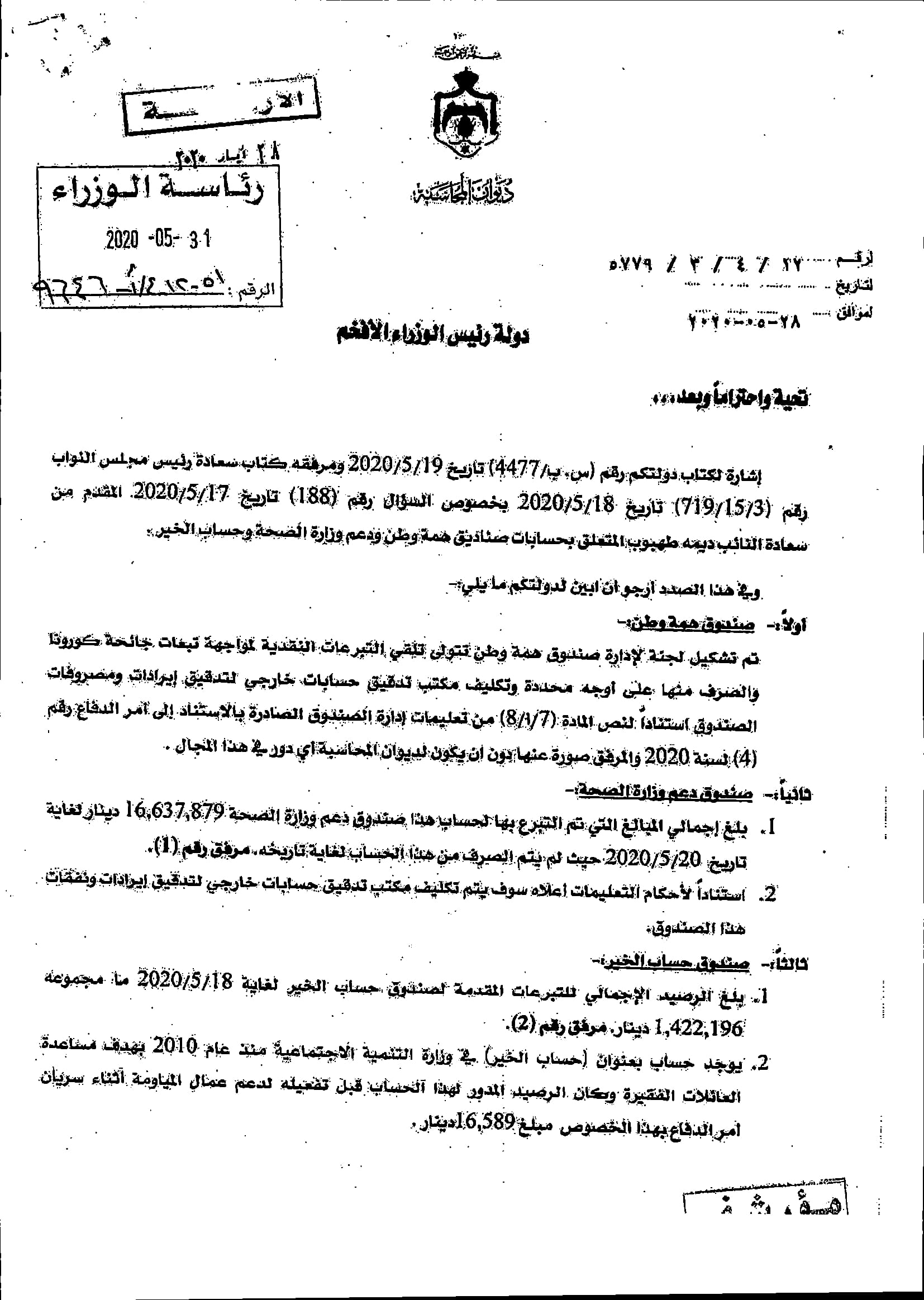 وبين جواب حداد، ان الامر ذاته ينسحب على حساب دعم وزارة الصحة حيث سيتم تعيين مدقق حسابات خارجي له وقد بلغ اجمالي المبالغ المتبرع بها لحسابه ١٦٦٣٧٨٧٩ دينار لغاية ٢٠-٥-٢٠٢٠، وبين انه لم يتم الصرف من هذا الحساب حتى تاريخه.