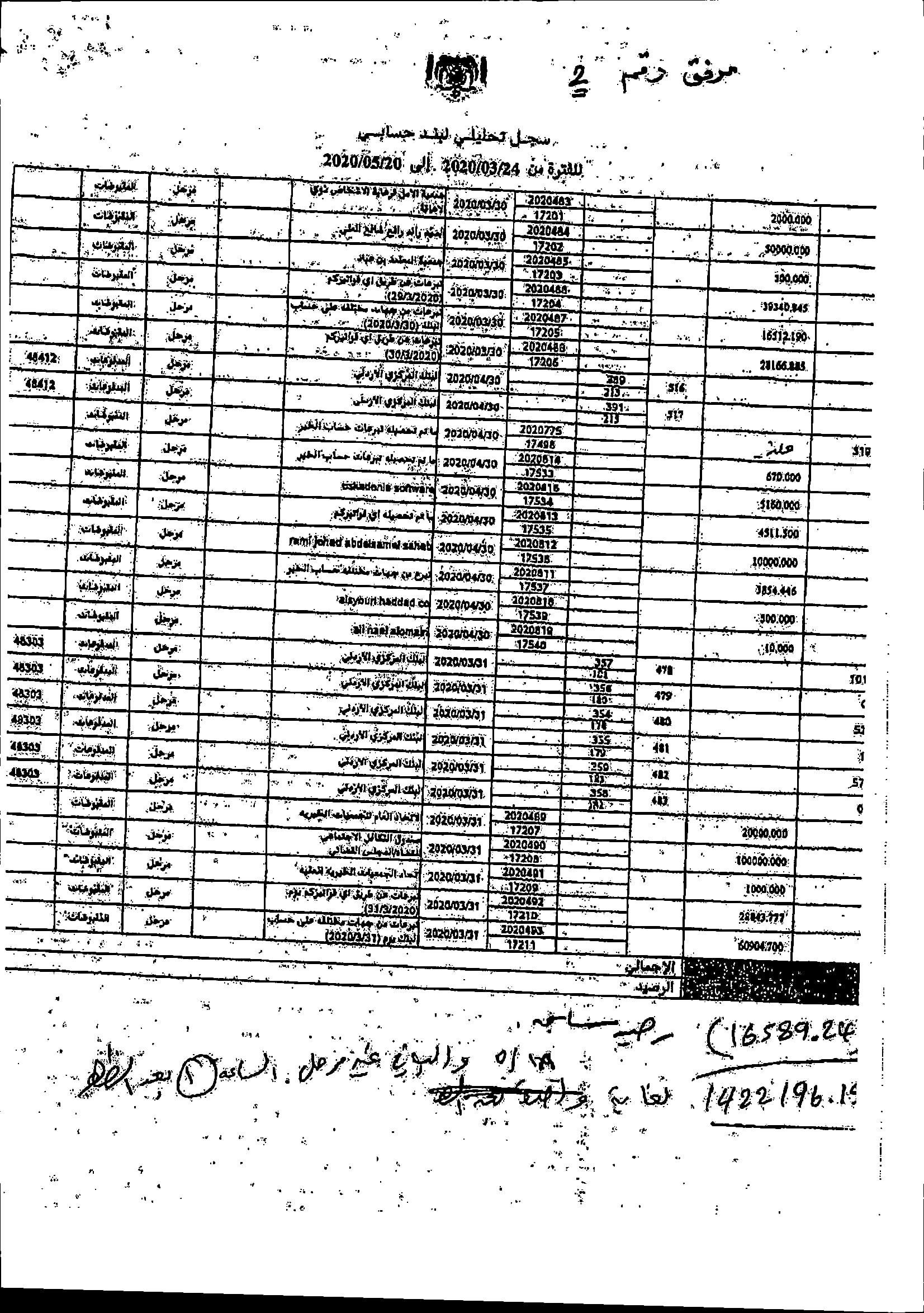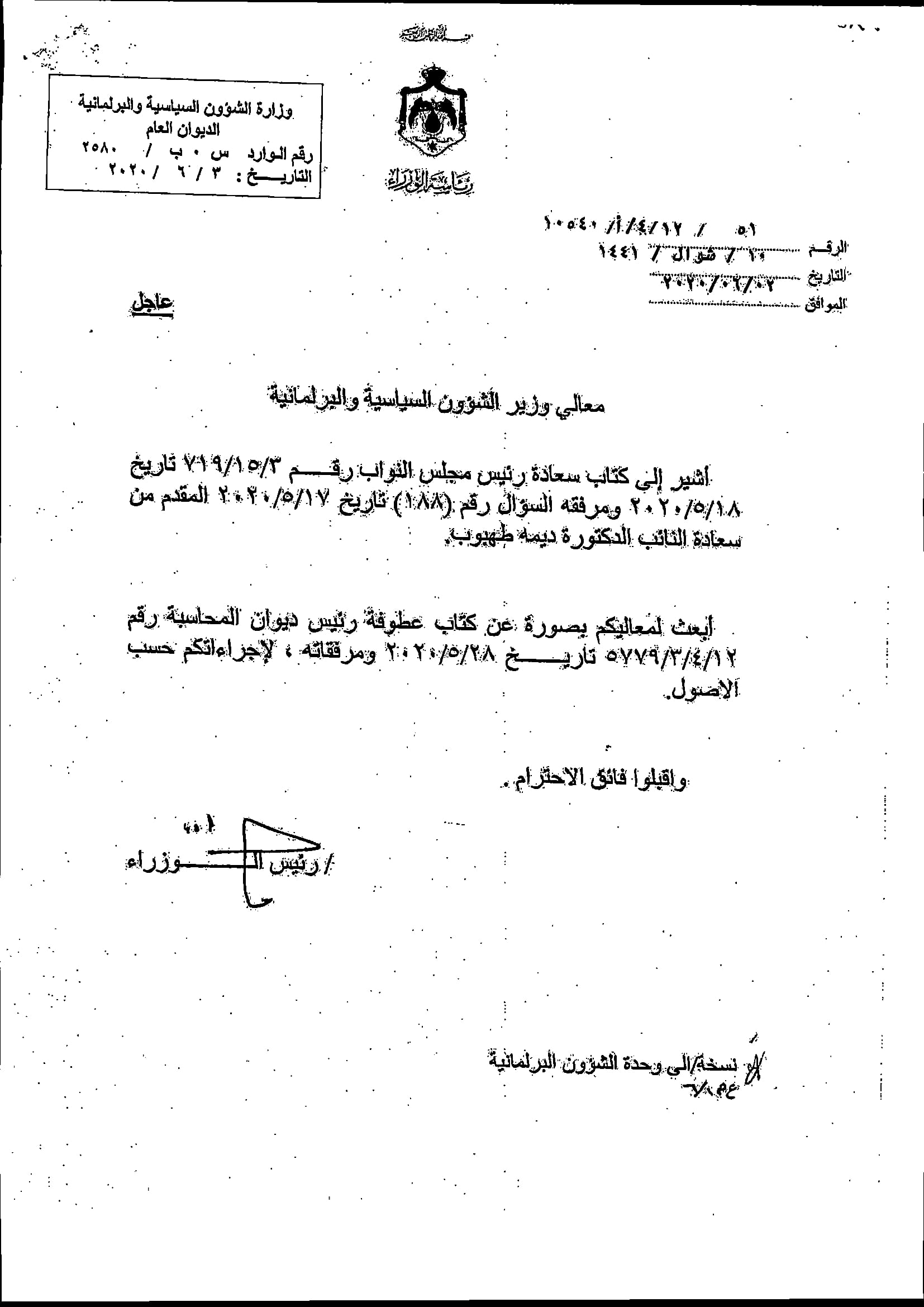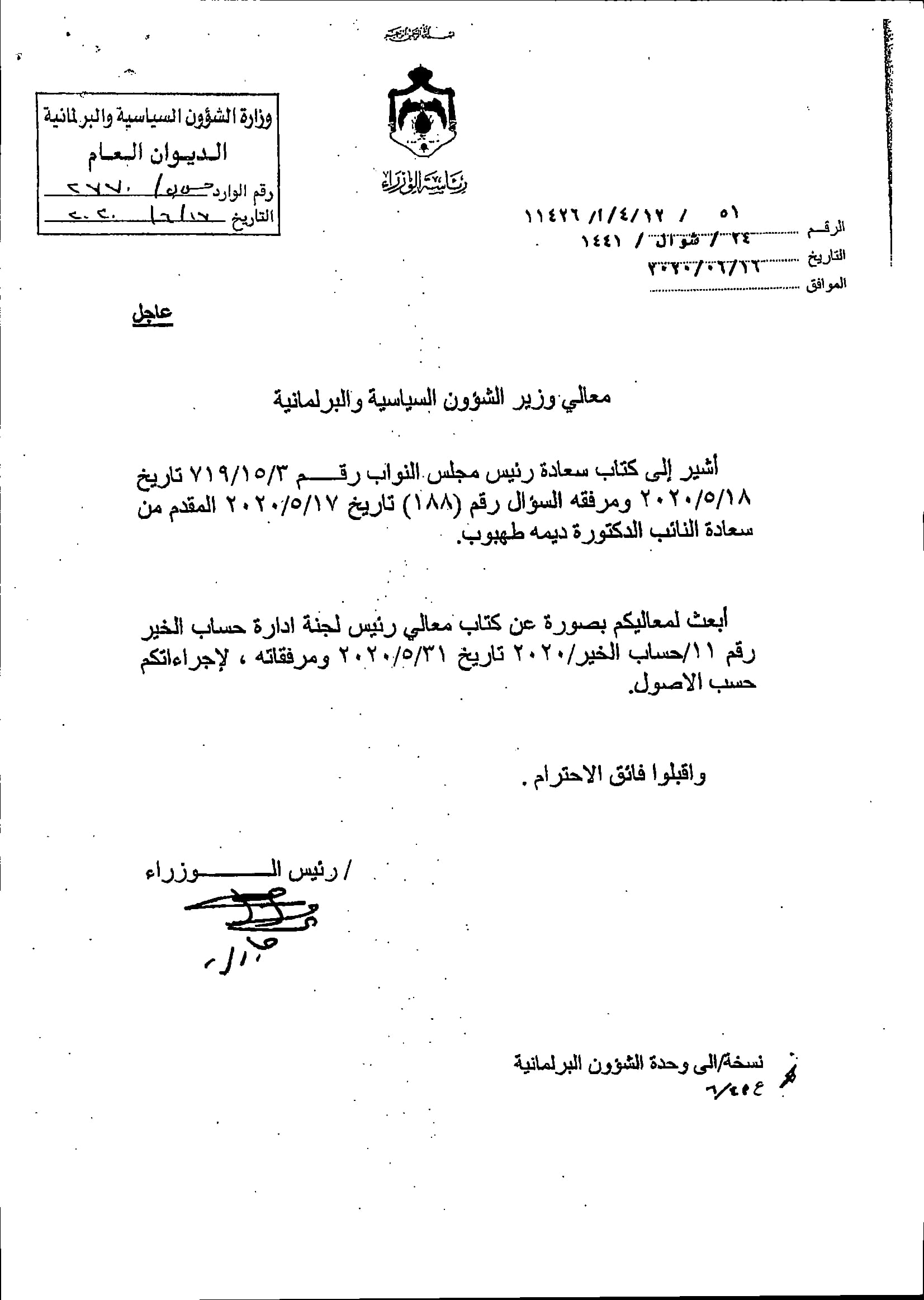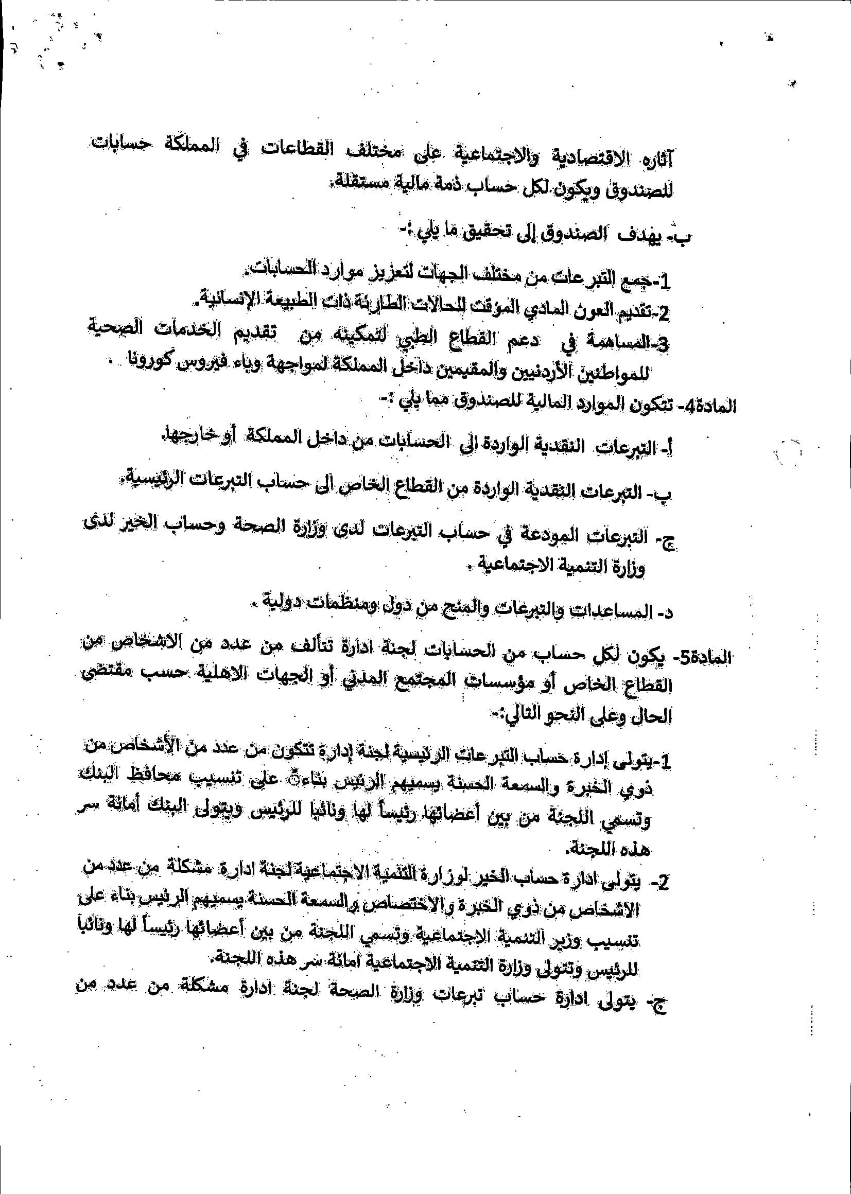 وبين جواب حداد، ان الامر ذاته ينسحب على حساب دعم وزارة الصحة حيث سيتم تعيين مدقق حسابات خارجي له وقد بلغ اجمالي المبالغ المتبرع بها لحسابه ١٦٦٣٧٨٧٩ دينار لغاية ٢٠-٥-٢٠٢٠، وبين انه لم يتم الصرف من هذا الحساب حتى تاريخه.