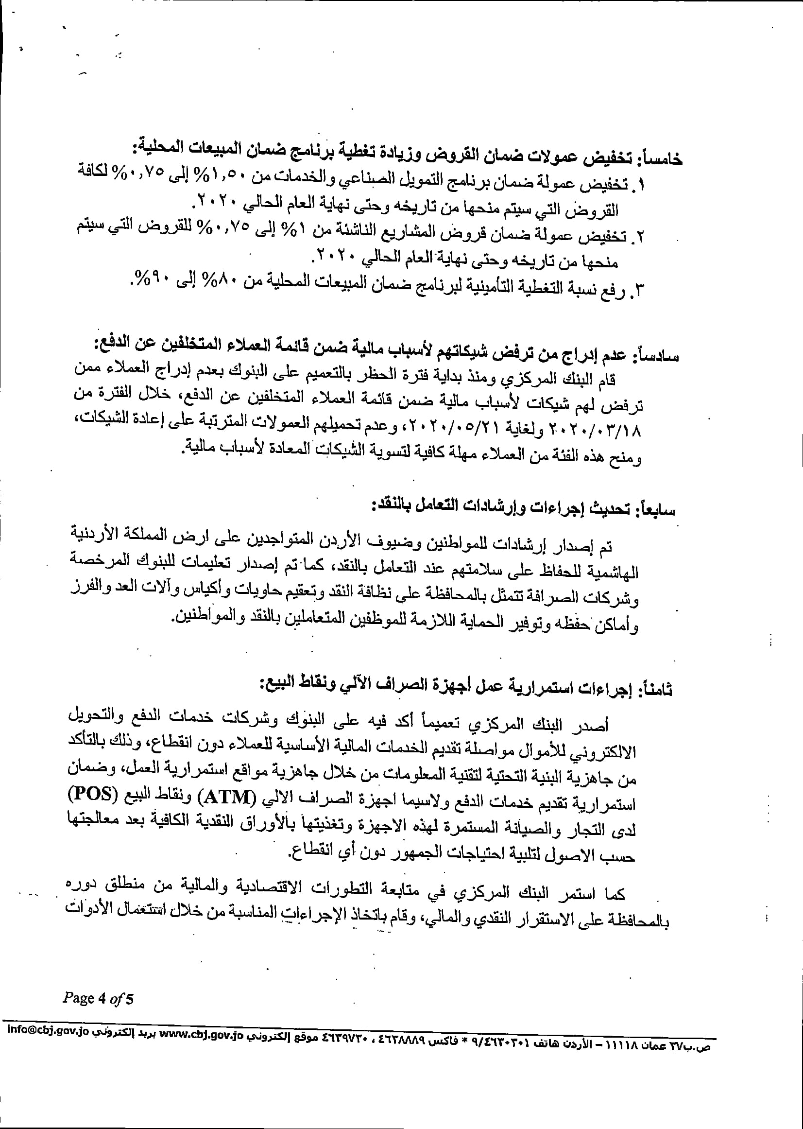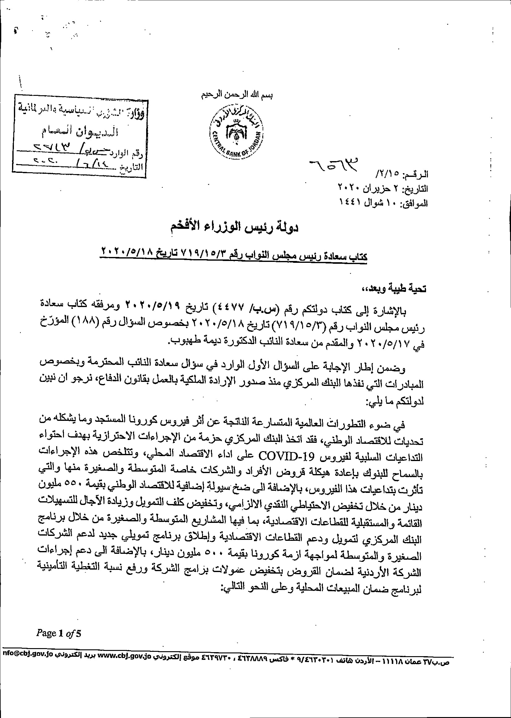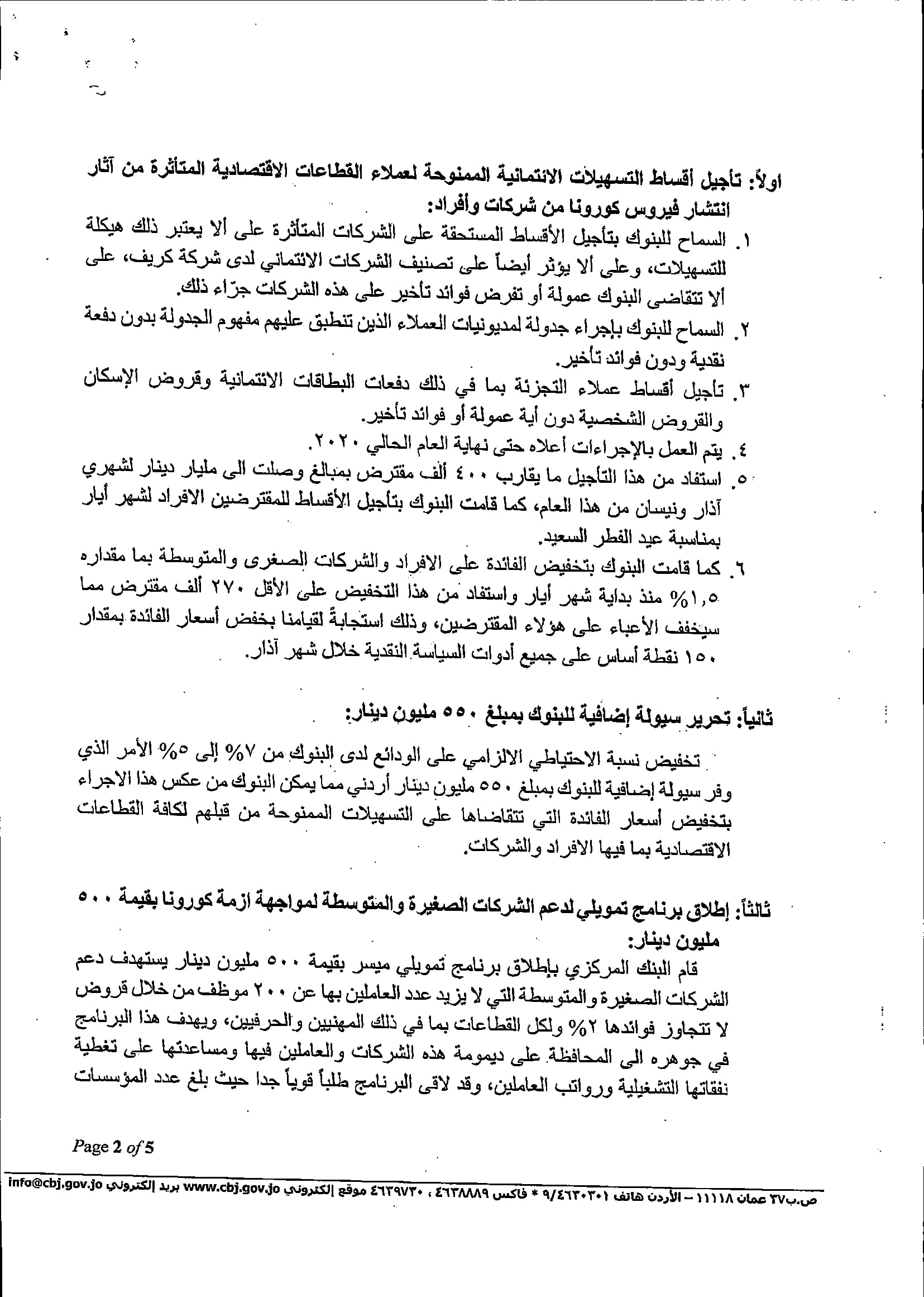 ١. تأجيل أقساط التسهيلات الائتمانية لعملاء القطاعات الاقتصادية من شركات وافراد على ان يتم العمل بالاجراءات حتى نهاية ٢٠٢٠، وقد بينت الاجابة ان ٤٠٠ الف مقترض استفادوا من هذا التأجيل بمبالغ وصلت الى مليار د لشهري اذار و نيسان.