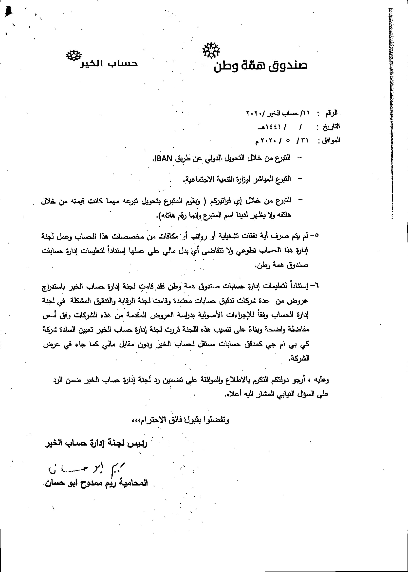 أما بخصوص المراقبة على الصندوق، فأجابت ان لجنة ادارة الحساب قامت باستدراج عروض من عدة شركات تدقيق حسابات معتمدة وفق اسس مفاضلة واضحة عينت اللجنة السادة شركة كي بي ام جي كمدقق حسابات مستقل لحساب الخير دون مقابل مالي كما جاء في عرض الشركة.