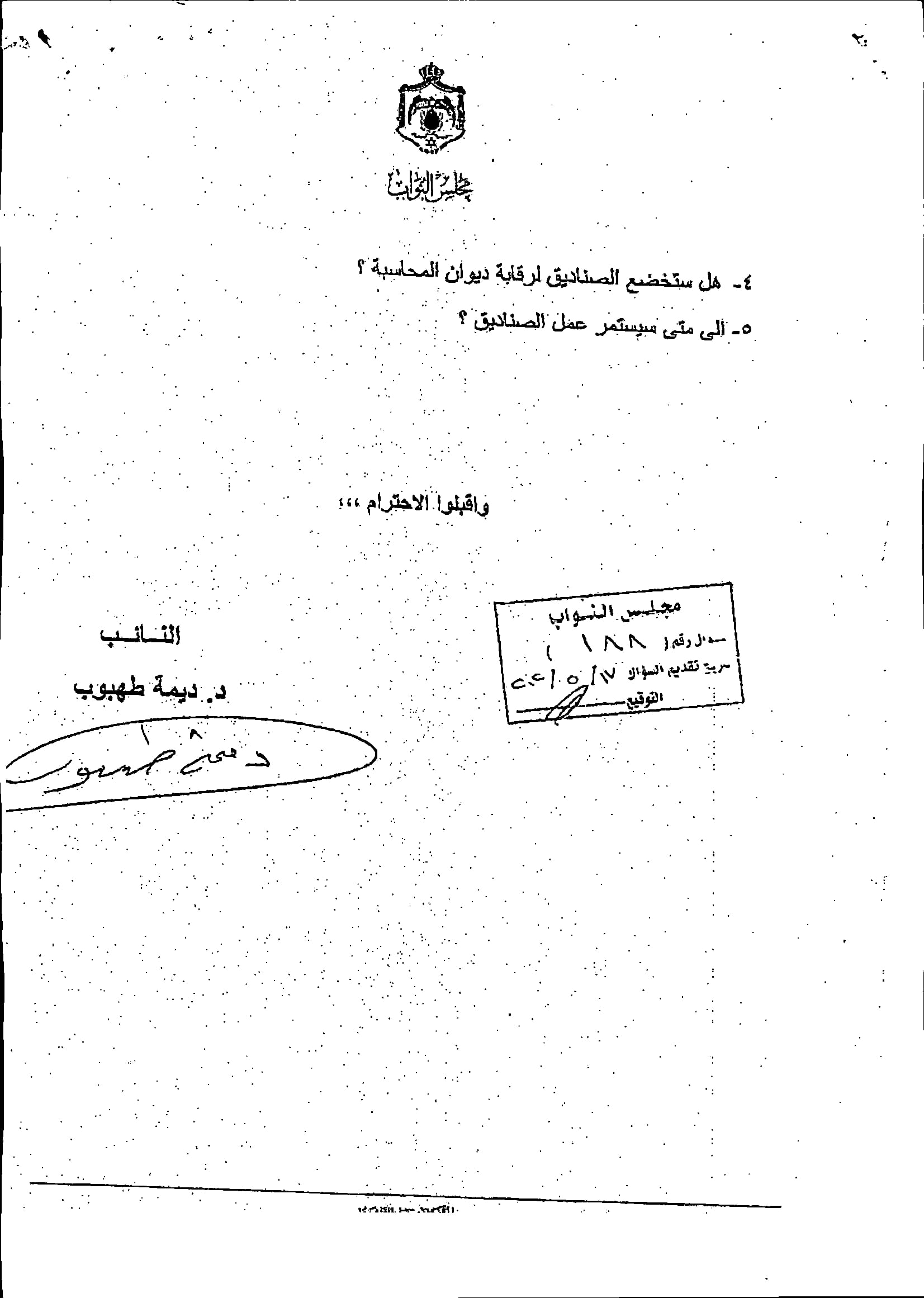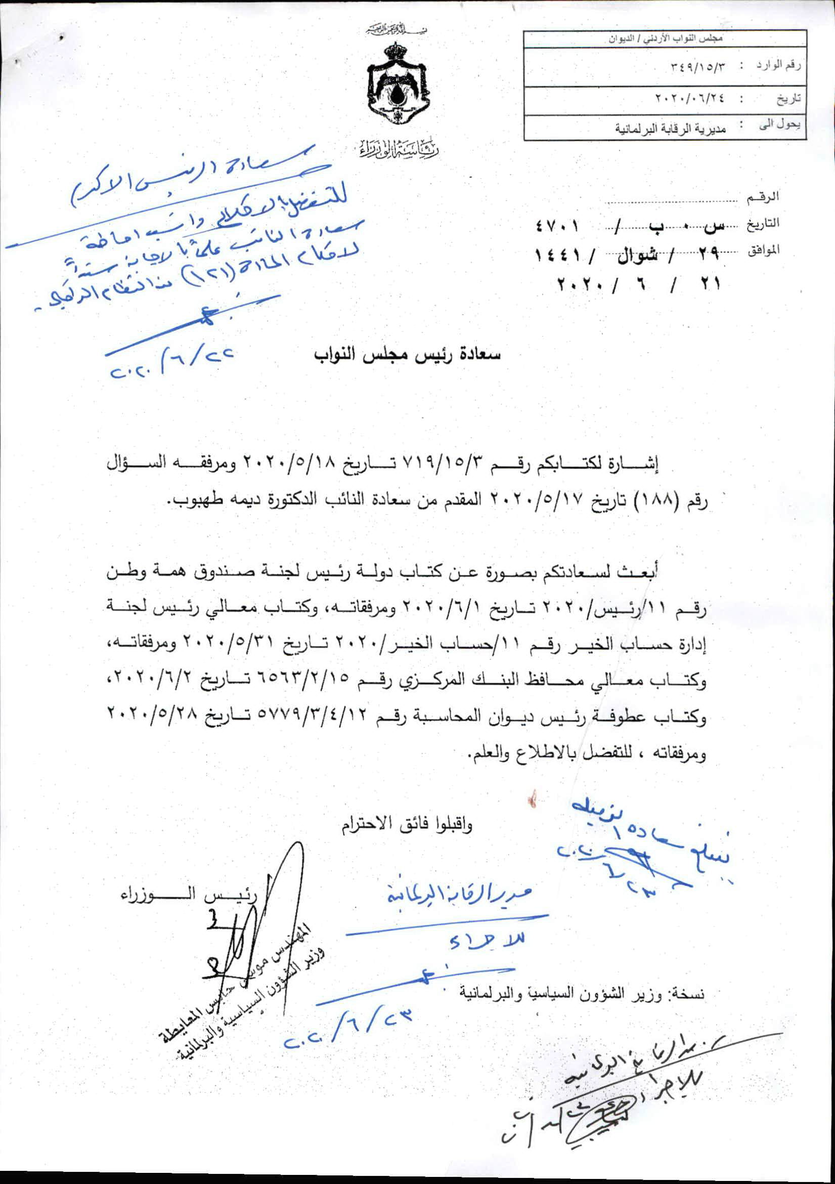 أجابت الحكومة من خلال رئيس لجنة صندوق همة وطن عبد الكريم الكباريتي ورئيس لجنة ادارة حساب الخير ريم أبو حسان ومحافظ البنك المركزي الدكتور زياد فريز ورئيس ديوان المحاسبة عاصم حداد على اسئلة النائب ديمة طهبوب في 55 صفحة والمتعلقة بصندوق همة وطن والصناديق التابعة له والتبرعات التي تلقاها.