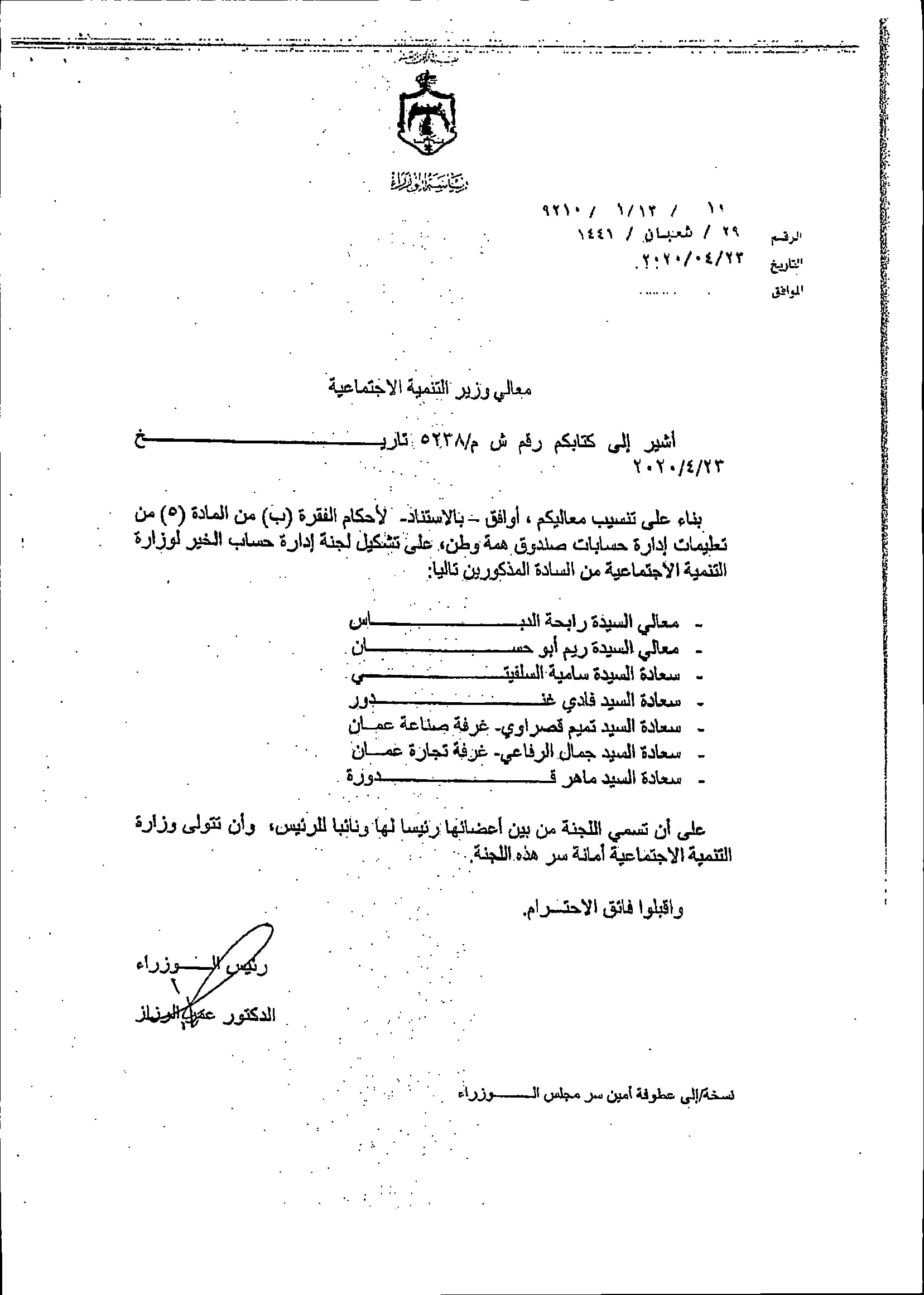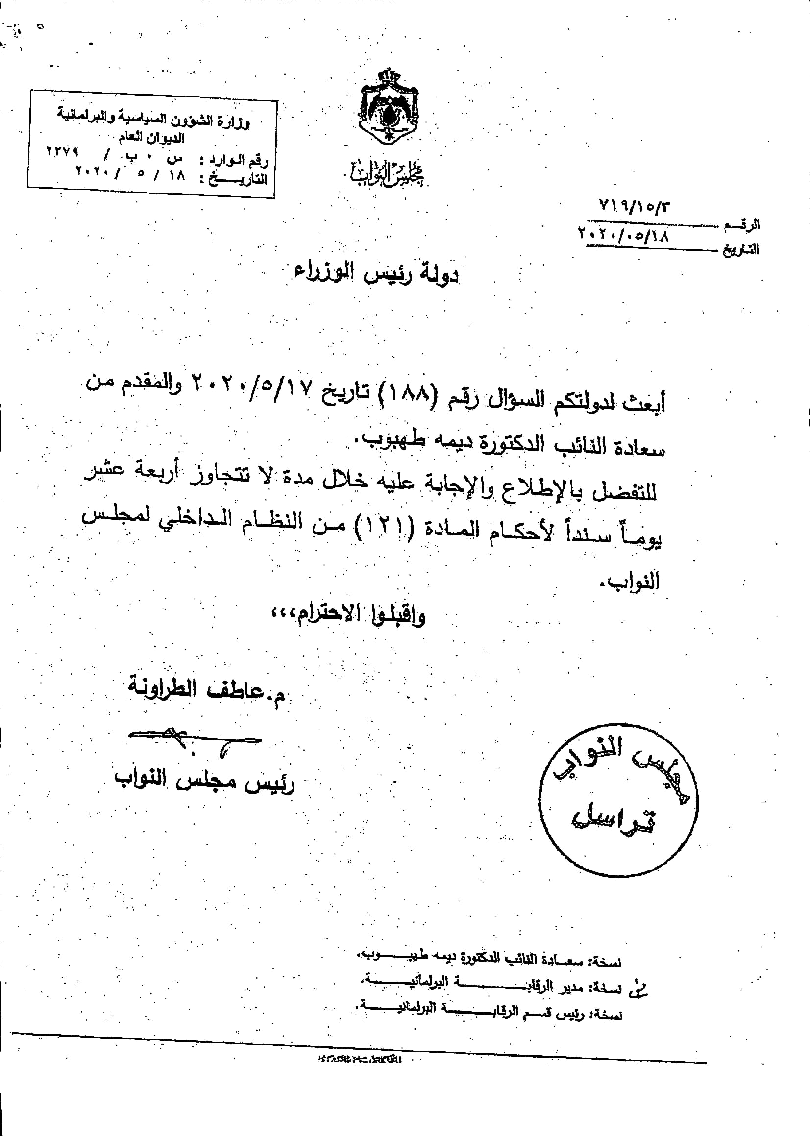 واضافت في جوابها لاسئلة طهبوب انه تقرر بموجب امر دفاع رقم ٤ لسنة ٢٠٢٠ الاستمرار بالحساب واعتماده كأحد حسابات همة وطن بلجنة ادارة مستقلة وتقوم وزارة التنمية بإدارة سر هذه اللجنة ويعمل عدد من مدراء المديرات في الوزارة كضباط ارتباط مع اللجان الفرعية لادارة الحساب .