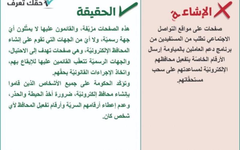وجاء الإيضاح الحكومي، بعد تردد إشاعة مفادها أنّ "صفحات على مواقع التواصل الاجتماعي تطلب دعم المستفيدين من برنامج دعم عمال المياومة وإرسال الأرقام الخاصة بتفعيل محافظهم الإلكترونية لمساعدتهم على سحب مستحقاتهم".