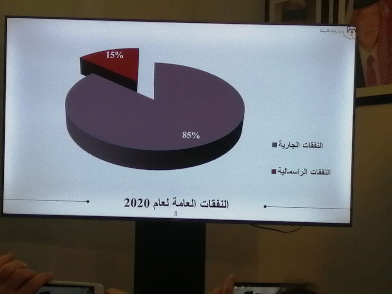 وأكد العسعس أن نسبة الرواتب من النفقات الجارية 65%، فيما تبلغ فوائد الدين العام 15، والنفقات التشغيلية 10%، و10% لنفقات جارية آخرى، فيما تبلغ "نسبة النفقات الجارية بلغت 15% والرأسمالية 85%.