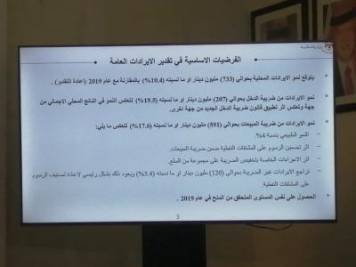 وفي تقدير الإيرادات العامة، بين العسعس "يتوقع نمو الإيرادات العامة بحوالي 733 مليون دينار، ما نسبته 10.4%، مقارنة مع العام الماضي في إعادة التقدير".