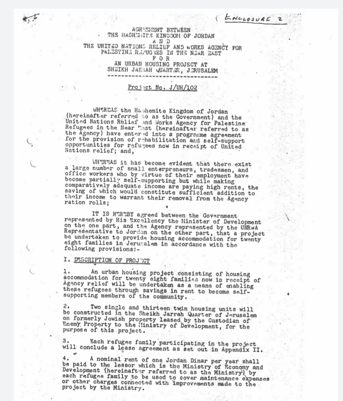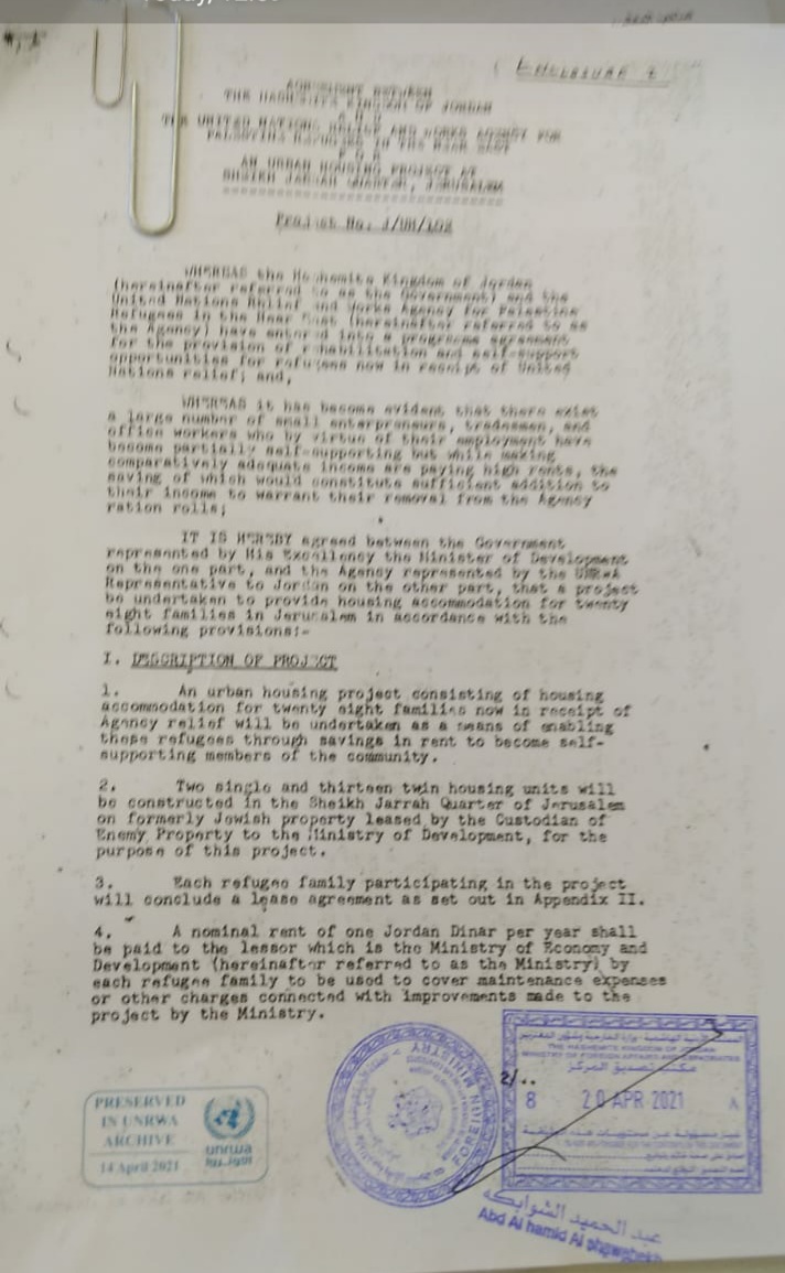 أكدت وزارة الخارجية وشؤون المغتربين أنه جرت وعلى مدى سنوات عملية بحث دقيقة ومطولة في سجلات الدوائر الرسمية الأردنية للوثائق التي تبيّن قيام وزارة الإنشاء والتعمير الأردنية سابقاً بإبرام عقود تأجير وحدات سكنية لعدد من أهالي الشيخ جراح في العام ١٩٥٦.