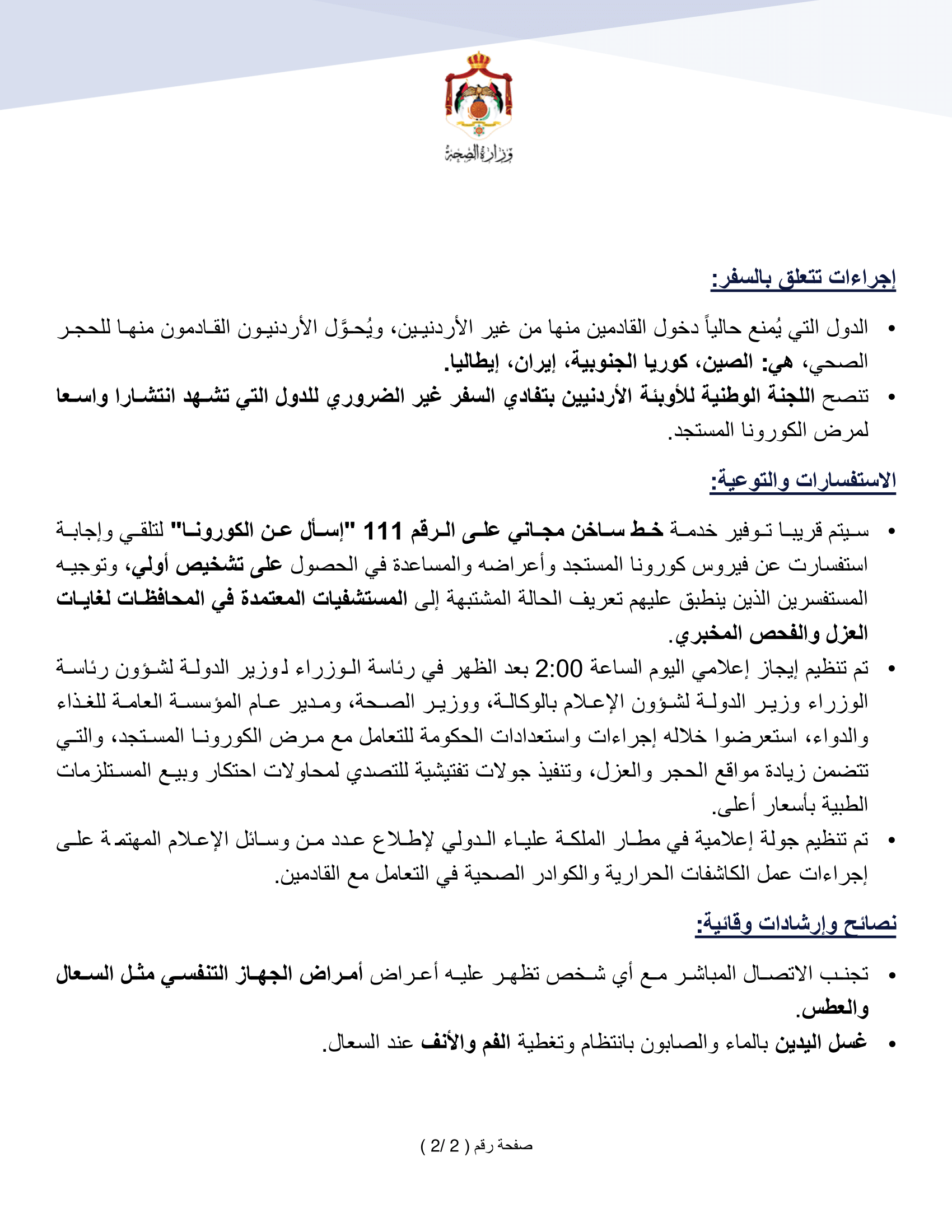 تنصح اللجنة الوطنية للأوبئة الأردنيين بتفادي السفر غير الضروري للدول التي تشهد انتشارا واسعا لمرض الكورونا المستجد.