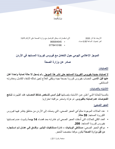 تم تنظيم إيجاز إعلامي اليوم الساعة 2:00 بعد الظهر في رئاسة الوزراء لوزير الدولة لشؤون رئاسة الوزراء وزير الدولة لشؤون الإعلام بالوكالة، ووزير الصحة، ومدير عام المؤسسة العامة للغذاء والدواء، استعرضوا خلاله إجراءات واستعدادات الحكومة للتعامل مع مرض الكورونا المستجد، والتي تتضمن زيادة مواقع الحجر والعزل، وتنفيذ جولات تفتيشية للتصدي لمحاولات احتكار وبيع المستلزمات الطبية بأسعار أعلى.