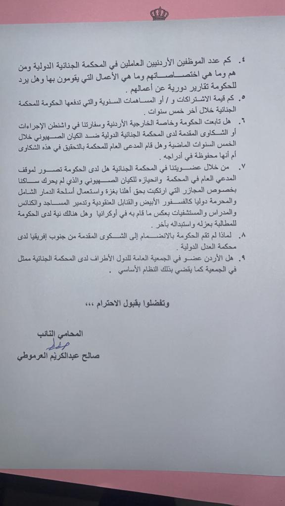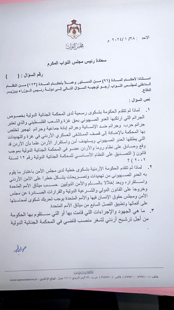 "1. لماذا لم تتقدم الحكومة بشكوى رسمية لدى المحكمة الجنائية الدولية بخصوص الجرائم التي ارتكبها العدو الصهيوني بحق غزة والشعب الفلسطيني والذي تعتبر جرائم حرب وجرائم ضد الإنسانية وجرائم إبادة جماعية وجرائم تهجير تختص بها المحكمة بالإضافة إلى قصف المستشفى العسكري الأردني في غزة والتهديدات التي يطلقها العدو الصهيوني ويستهدف أمن واستقرار الأردن علما بأن الأردن قد وقع وصادق على نظام روما والأردن عضو في المحكمة الجنائية الدولية بموجب قانون ( التصديق على النظام الأساسي للمحكمة الجنائية الدولية رقم ١٢ لسنة ٢٠٠٢ ) ؟