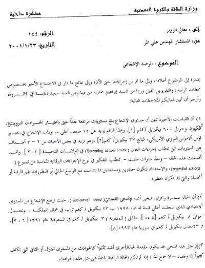 أما مستشار وزير الطاقة السابق الدكتور نضال المر فيؤكد في الوثيقة الثانية بان القياسات تبين ان مستوى الاشعاع مرتفع جداً حتى باعتبار الحوادث النووية الكبيرة اذ يبلغ 600 بيكيريل/كلغم وهذا رقم يزيد 15 ضعفاً عن اعلى مستوى اشعاع في مختبر لوس الاموس النووي الامريكي .