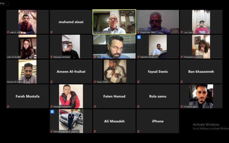 عقد مركز الشفافية الأردني مساء الأربعاء جلسة حوارية "عن بعد" مع نائب رئيس الوزراء الأسبق مروان المعشر بمشاركة عدد من أعضاء المركز وفرسان الشفافية ومجموعة من طلبة الجامعات.