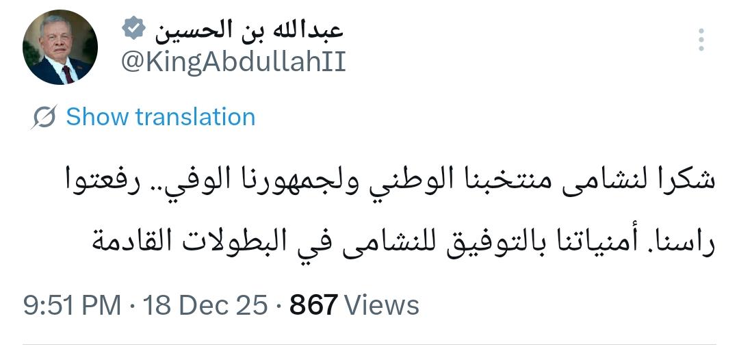 عبر الملك عبد الله الثاني بن الحسين عن فخره بالمستوى الذي قدمه منتخب النشامى في بطولة كأس العرب، ووفاء الجماهير الأردنية.