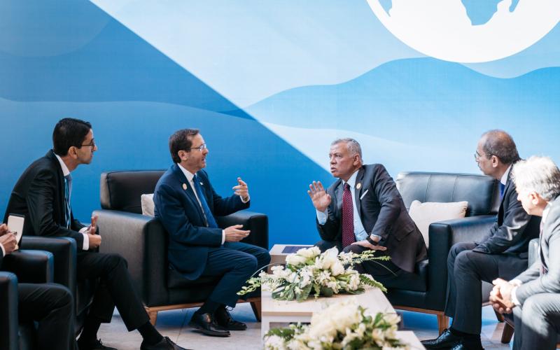 التقى الملك عبدالله الثاني، الرئيس الإسرائيلي إسحاق هرتسوغ، على هامش مؤتمر الأمم المتحدة لتغير المناخ COP27 المنعقد في مدينة شرم الشيخ.